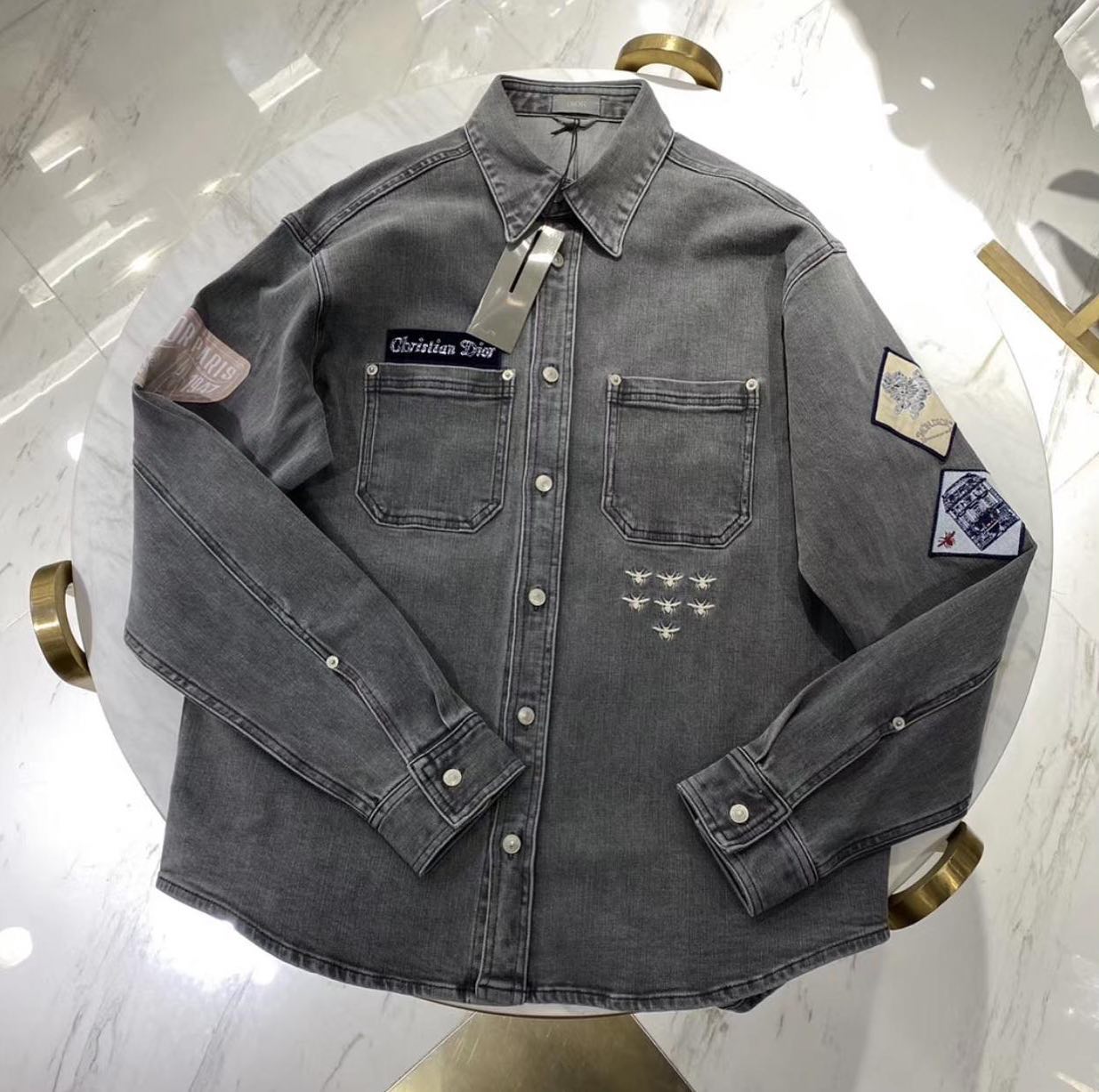 Эта женская рубашка Christian Dior LUX-36509 представляет собой стильный и современный предмет гардероба, выполненный в стиле кэжуал. Серая джинсовая ткань с эффектом легкой потертости придает ей особую изюминку. Рубашка украшена вышивкой в виде пчел на груди и тематическими нашивками на рукавах, что подчеркивает ее эксклюзивность и отсылает к знаковым элементам бренда.