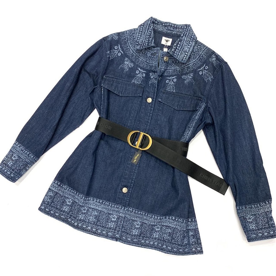 Рубашка женская Christian Dior LUX-16106 представляет собой стильный и элегантный предмет гардероба, выполненный в классическом синем дениме. Ее отличает изысканный орнамент, украшающий воротник, манжеты и нижний край изделия, а также акцентная черная лента-пояс с золотистой пряжкой CD, подчеркивающая талию.