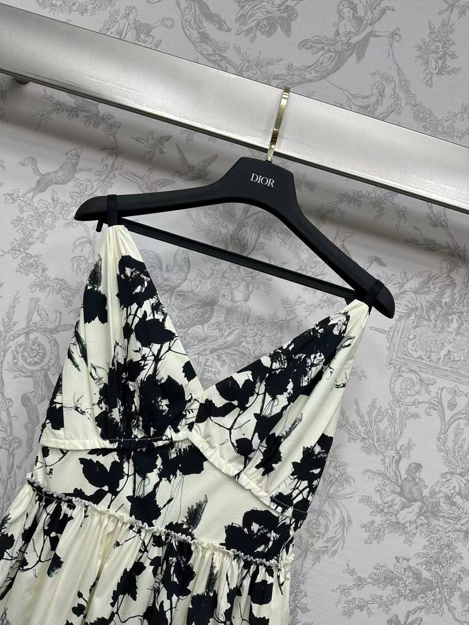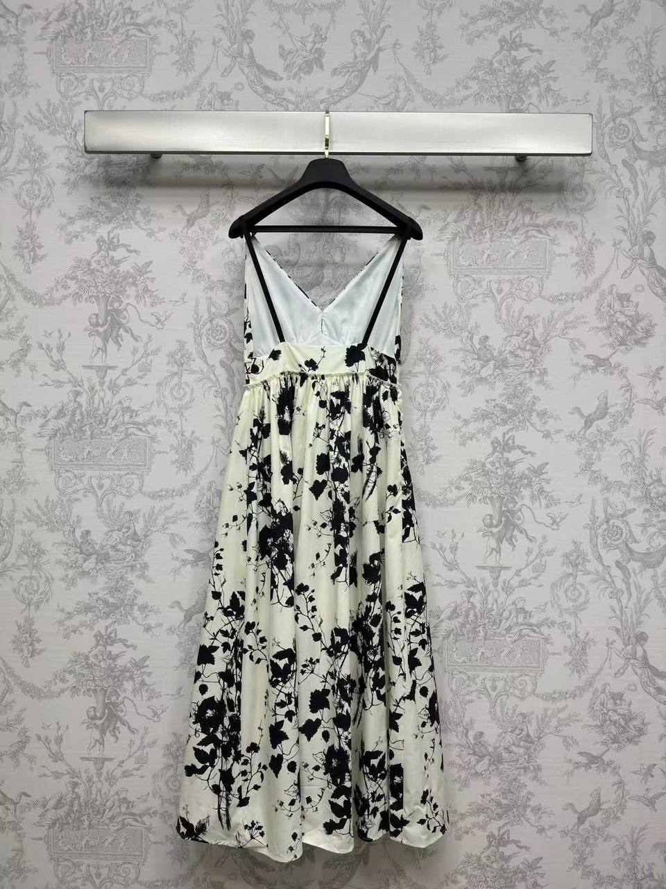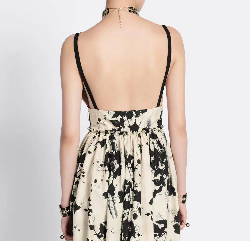 Сарафан Christian Dior LUX-105448 — это элегантное летнее платье с цветочным принтом. Сарафан выполнен в кремовом цвете с черными флористическими узорами, имеет V-образный вырез и тонкие бретели. Идеально подходит для летних прогулок и особых случаев, сочетая в себе стиль и комфорт.