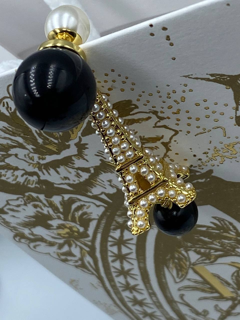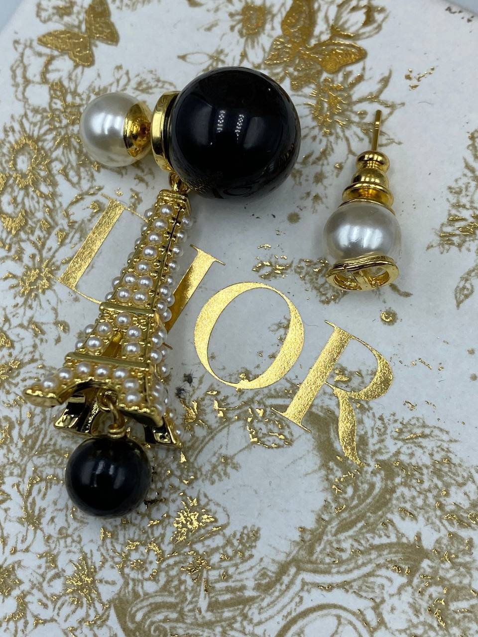 Серьги Christian Dior LUX-98082 - это изысканное украшение, сочетающее в себе элегантность и современный дизайн. Серьги представляют собой сочетание черного глянцевого шара, золотистой фурнитуры, искусственного жемчуга и формы Эйфелевой башни, что придает им неповторимый шарм. Они идеально подойдут для создания стильных и запоминающихся образов.
