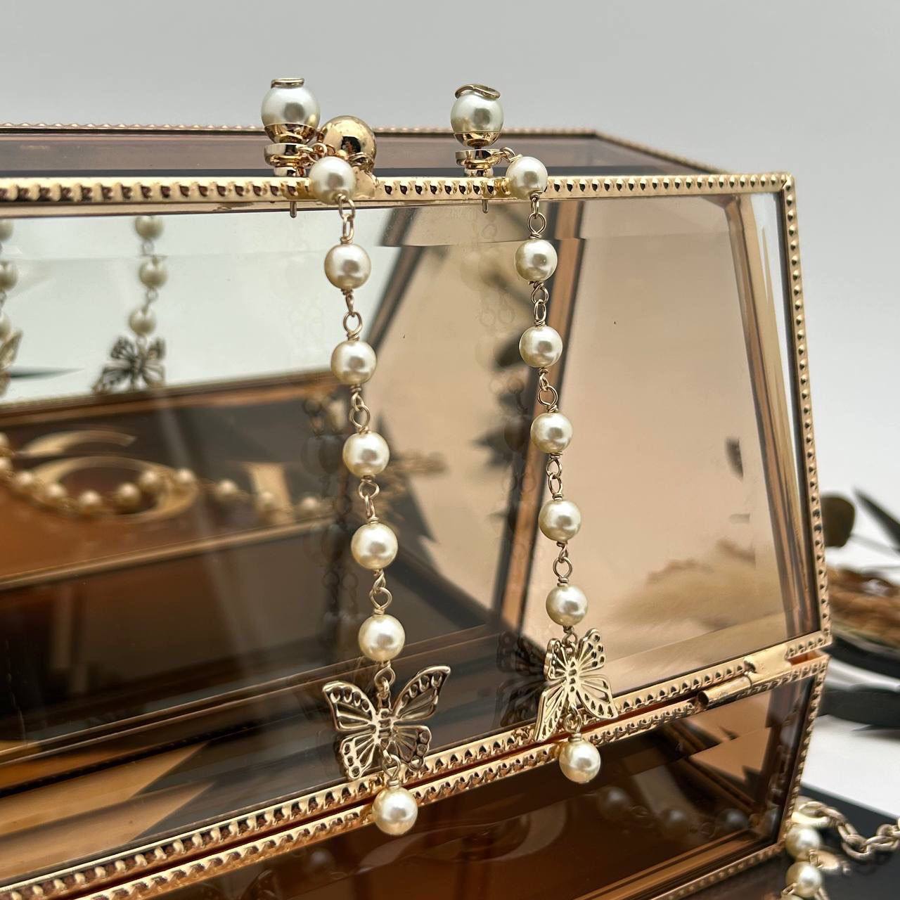 Серьги Christian Dior LUX-112255 – изящное украшение, выполненное в классическом стиле. Сережки золотистого цвета с жемчужинами и элементами в виде бабочек, которые дополняют образ своей утонченностью. Идеально подойдут для создания женственного и элегантного образа.