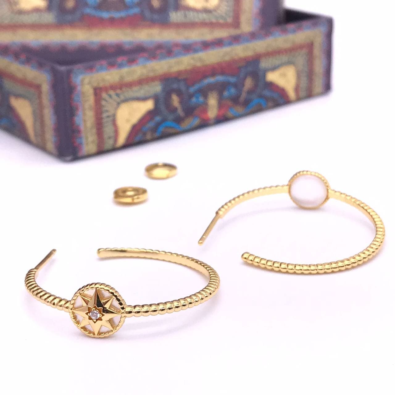 Серьги Christian Dior LUX-62639 представляют собой изысканное ювелирное украшение, выполненное в современном стиле. Эти серьги-кольца, украшенные элегантным дизайном с элементами компаса и вставкой из натурального камня, добавят изысканности любому образу. Они идеально подойдут для повседневного ношения или для особых случаев, подчеркивая утонченный вкус владелицы.