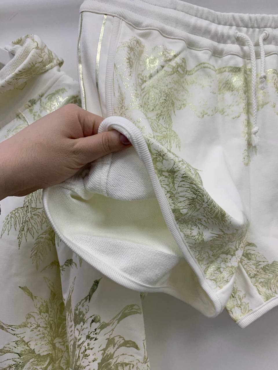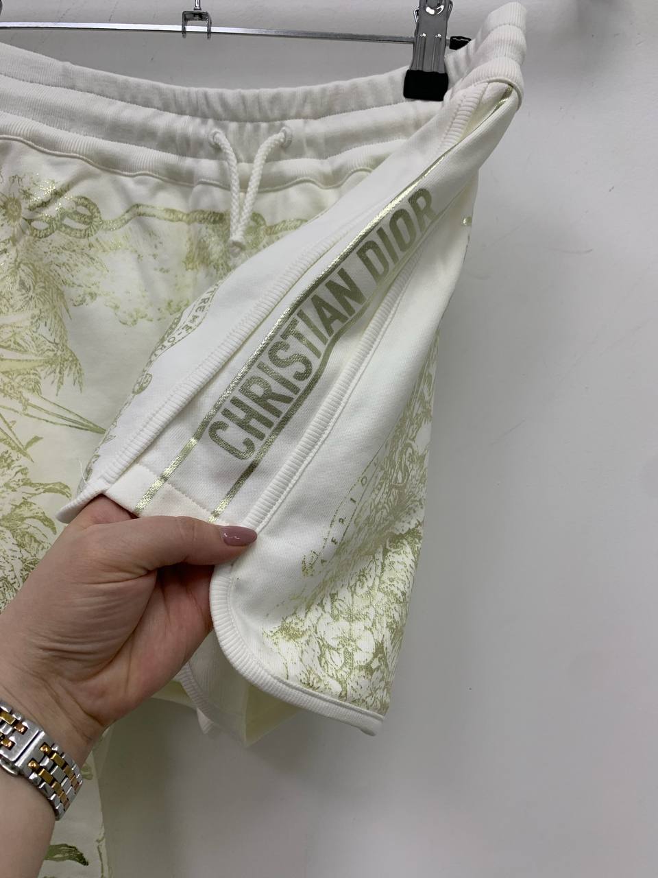 Шорты Christian Dior LUX-87741 – это стильная модель, сочетающая в себе комфорт и элегантность. Они выполнены в белом цвете с золотистым принтом, который придает изделию роскошный вид. Эти шорты идеально подойдут для создания модных повседневных образов.