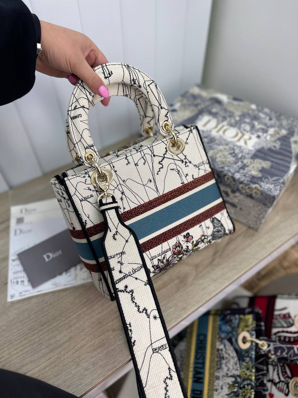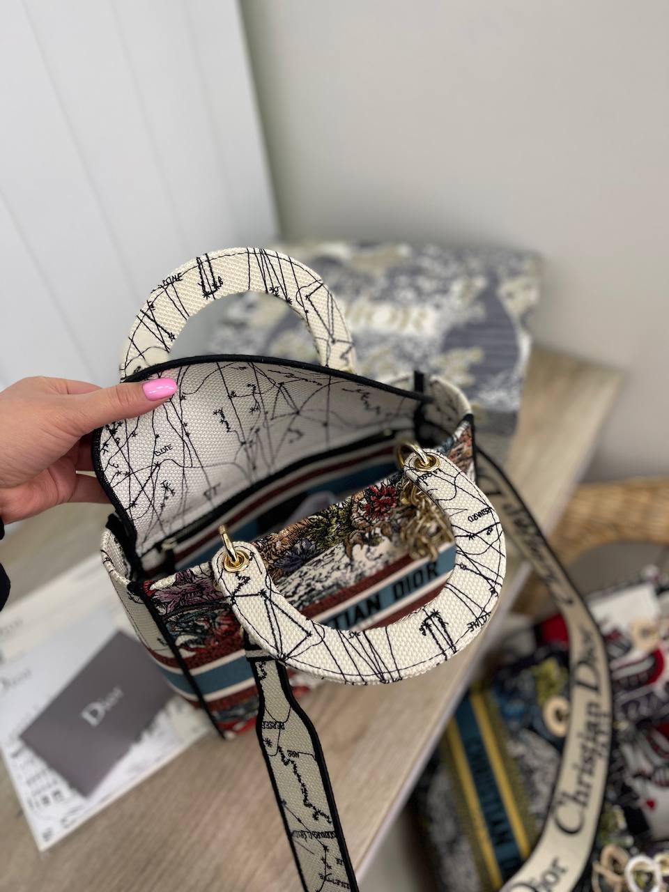 Женская сумка Christian Dior, представленная на изображении, выполнена в элегантном стиле. Сумка имеет разнообразный цветочный узор, который придает ей неповторимый шарм. Эта сумка идеально подойдет для повседневного использования, добавляя изысканности в любой образ.