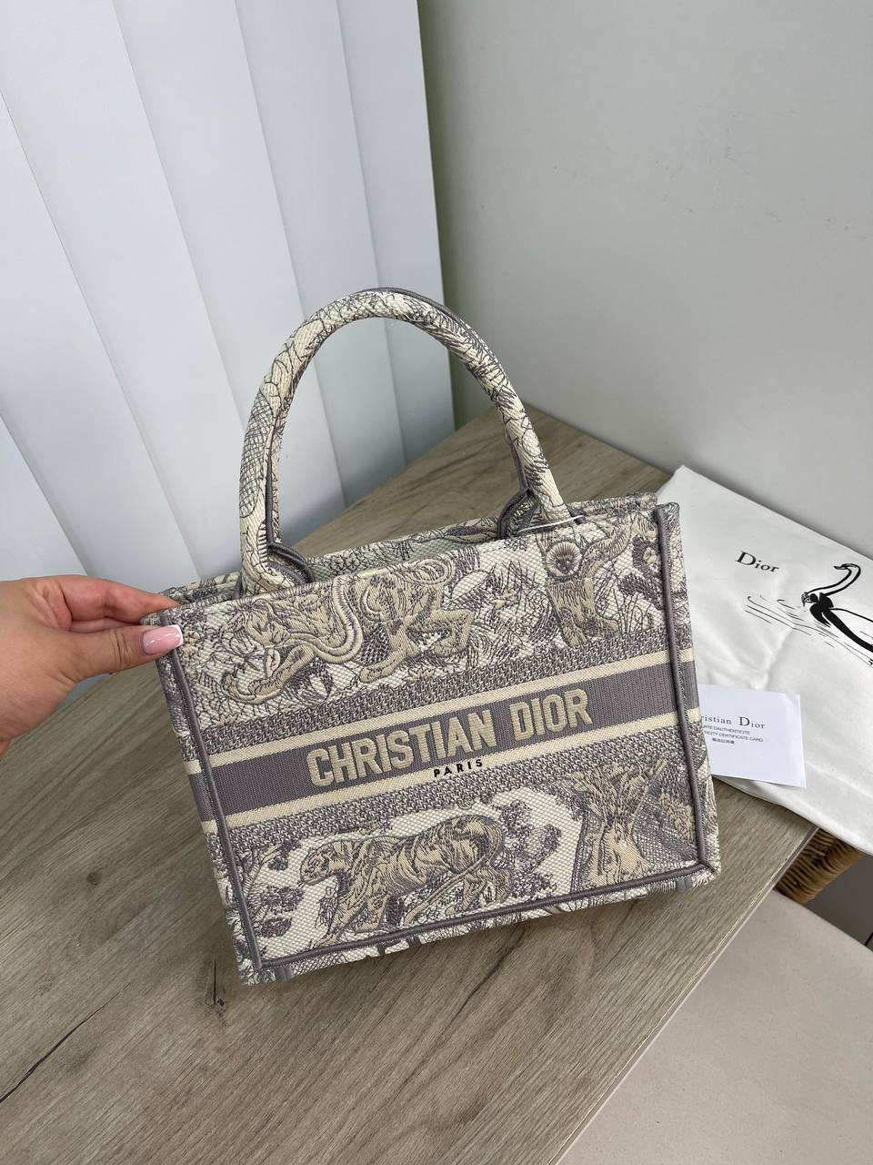 Эта женская сумка Christian Dior LUX-67797 представляет собой стильный аксессуар, выполненный в классическом силуэте tote. Ее дизайн украшен характерным принтом с изображением тигров и растительными мотивами, дополненным контрастной полосой с логотипом бренда "CHRISTIAN DIOR PARIS". Сумка идеально подойдет для создания элегантных и утонченных образов.
