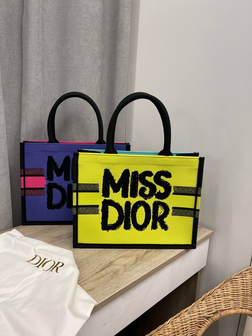 Сумка женская 36 см Christian Dior LUX-112937 выполнена в ярком стиле, идеальна для тех, кто ценит оригинальность и узнаваемость. Желтый цвет основы сумки привлекает внимание, а черные ручки и надписи "MISS DIOR" добавляют контрастности. Эта сумка станет отличным дополнением к вашему повседневному образу.