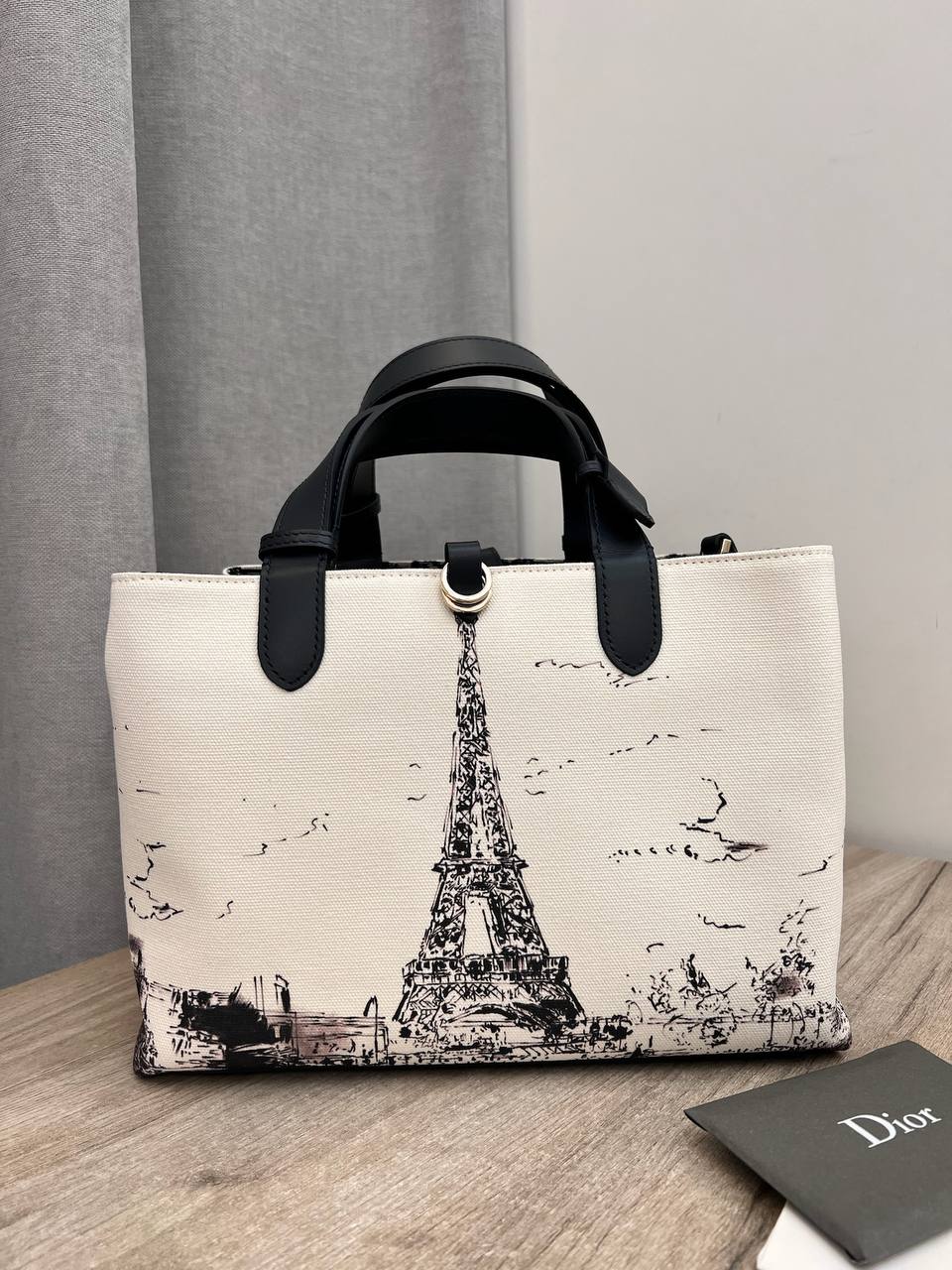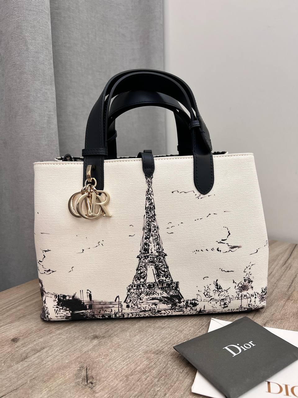 Сумка женская Christian Dior LUX-108767 — это стильный аксессуар, сочетающий в себе элегантность и практичность. Дизайн сумки украшен изображением Эйфелевой башни, что придает ей особый шарм. Сумка выполнена в кремовом цвете с черными ручками, что позволяет легко сочетать ее с различными образами.