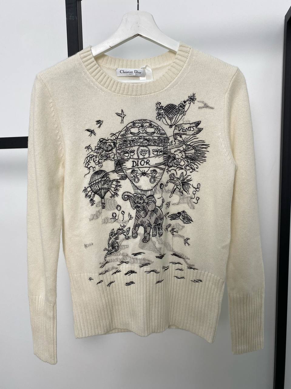 Представляем женский свитер Christian Dior LUX-55508, выполненный в кремовом цвете. Этот уникальный свитер с длинными рукавами украшен изящной вышивкой, изображающей слона, воздушный шар и тропические мотивы, что придает ему особый шарм. Модель с круглым вырезом горловины идеально подойдет для создания стильных и запоминающихся образов.