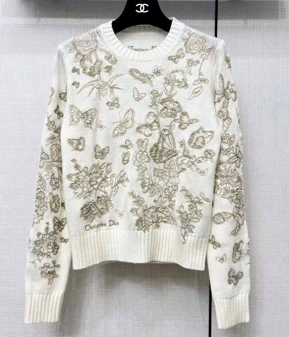 Свитер женский Christian Dior LUX-100235 – это воплощение элегантности и изысканности. Белоснежный свитер украшен узором из золотистых цветов и бабочек, придающим ему романтичный вид. Прекрасно подходит для создания стильных образов в повседневной жизни.