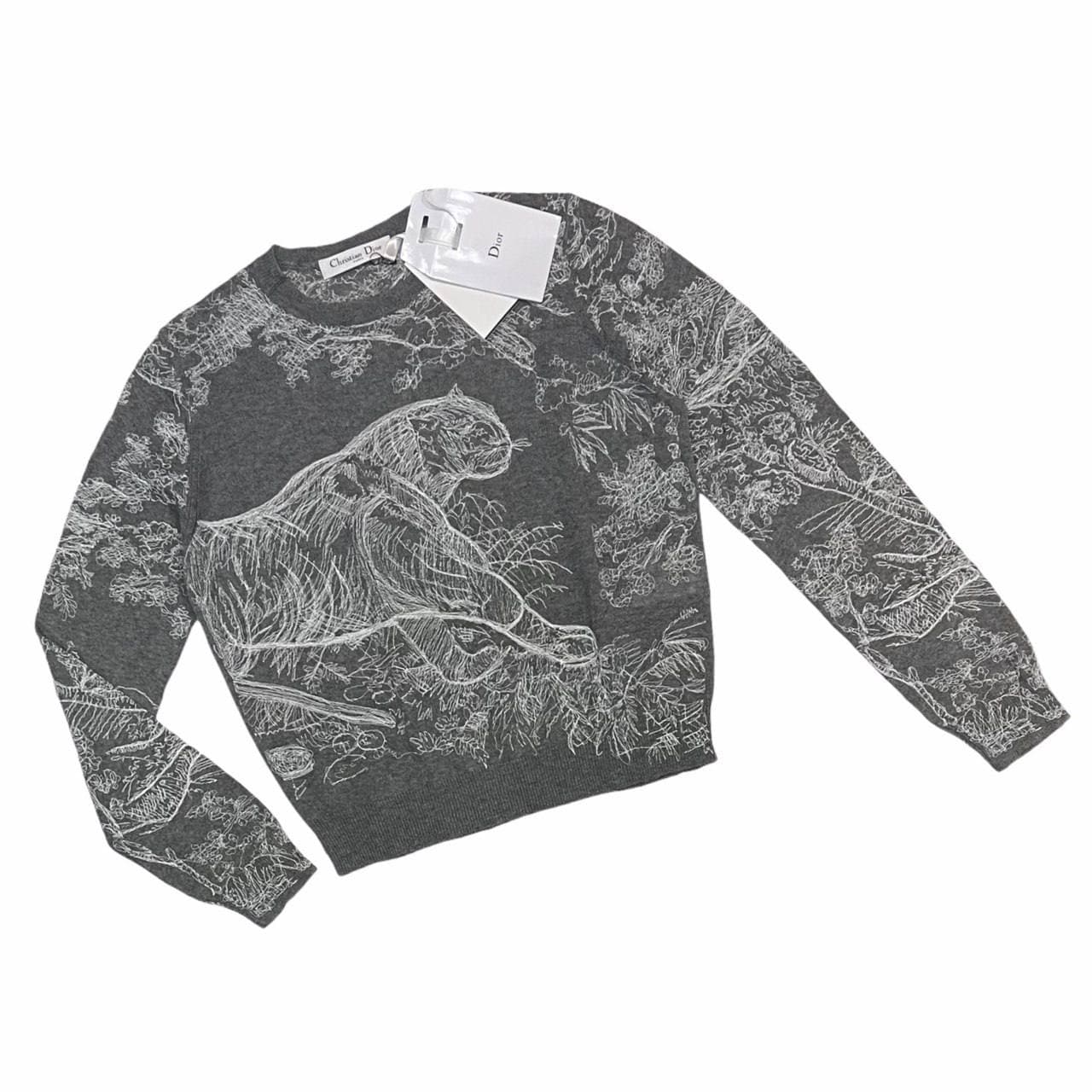 Свитер женский Christian Dior LUX-54408 – это стильное и элегантное дополнение к вашему гардеробу. Эта модель выполнена в сером цвете с изысканным узором, изображающим грациозного тигра среди растительных мотивов. Она идеально подойдет для создания как повседневных, так и более изысканных образов.