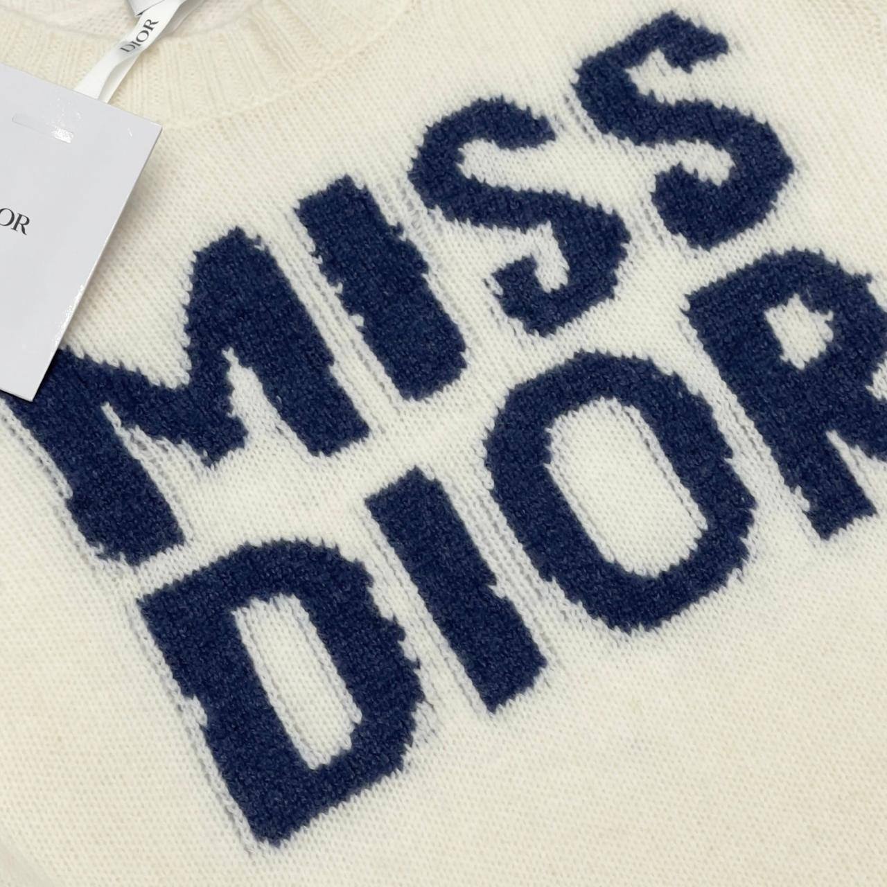 Женский свитер Christian Dior LUX-110190 – это стильный предмет гардероба, сочетающий в себе элегантность и комфорт. Модель выполнена в кремовом цвете с надписью "MISS DIOR" синего цвета. Свитер идеально подходит для повседневного использования и способен дополнить любой образ.