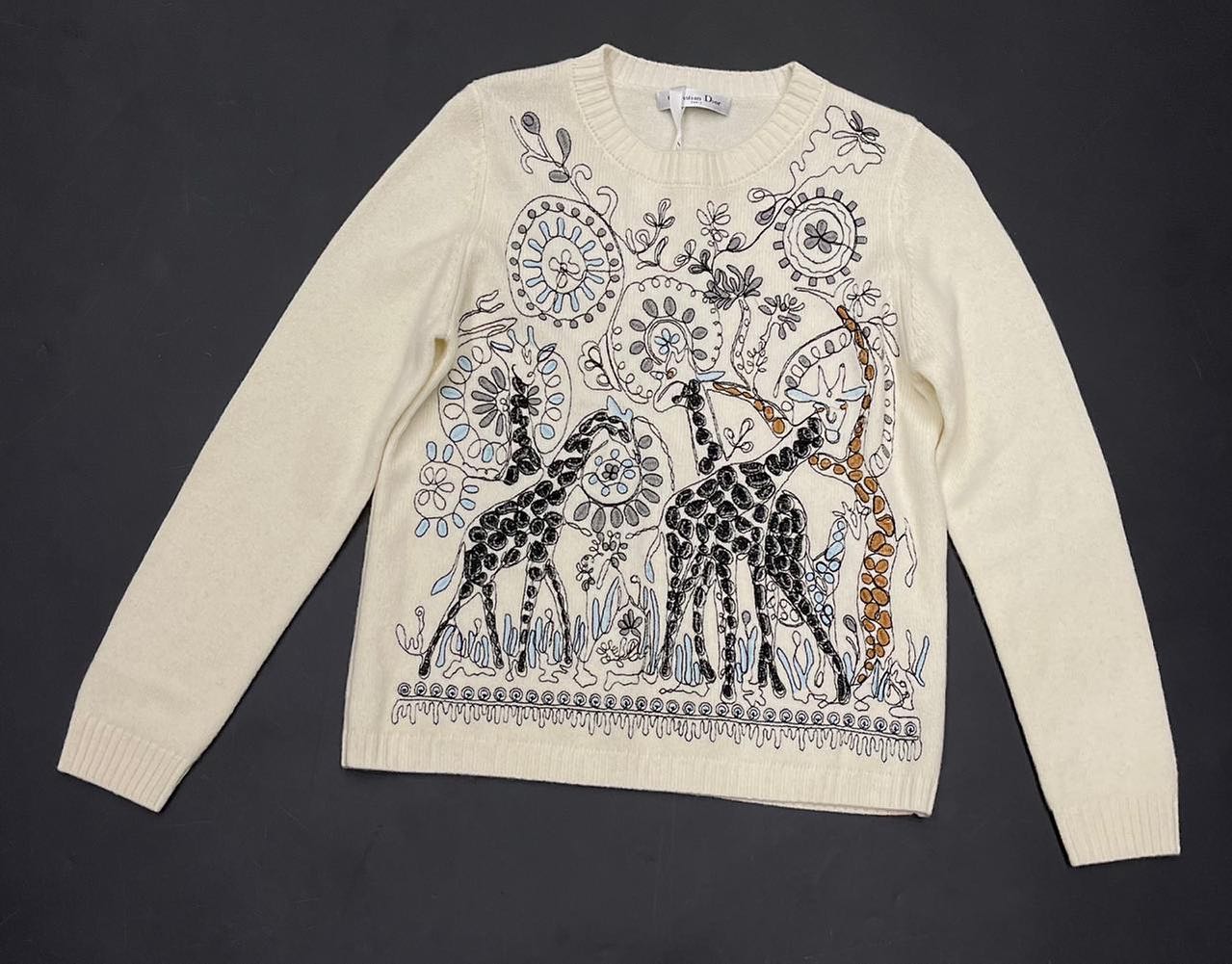 Этот женский свитер Christian Dior LUX-42328 представляет собой элегантное и стильное дополнение к гардеробу. Его кремовый цвет и оригинальный принт с изображениями жирафов и флористическими мотивами придают изделию уникальность. Модель с длинными рукавами и круглым вырезом идеально подходит для создания как повседневных, так и более изысканных образов.