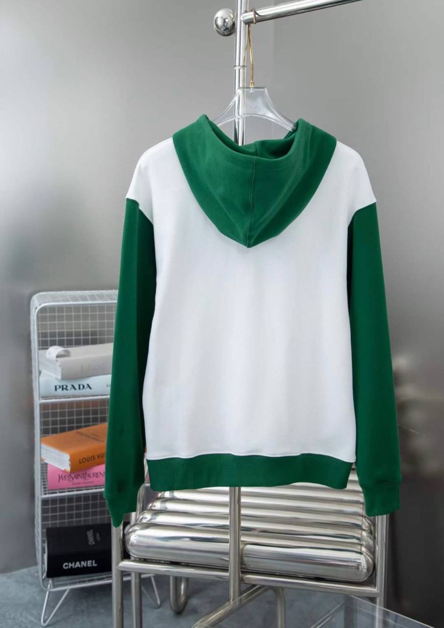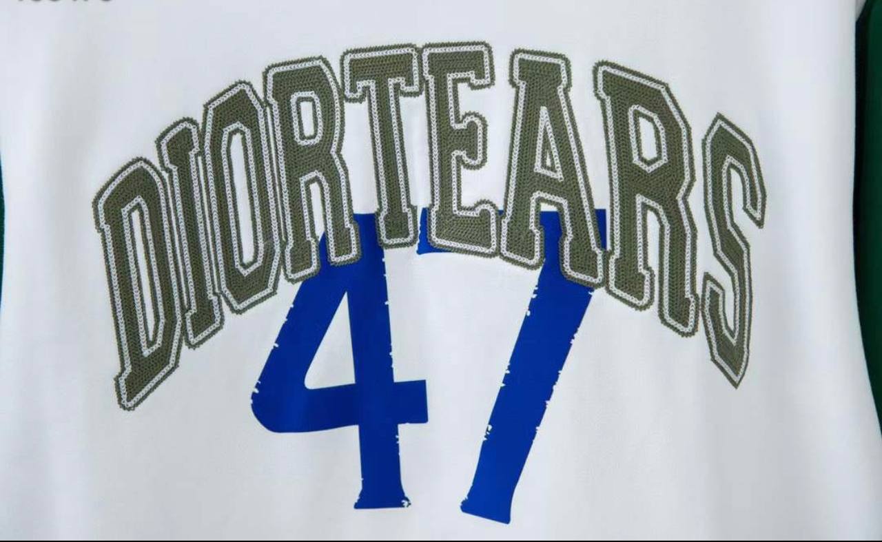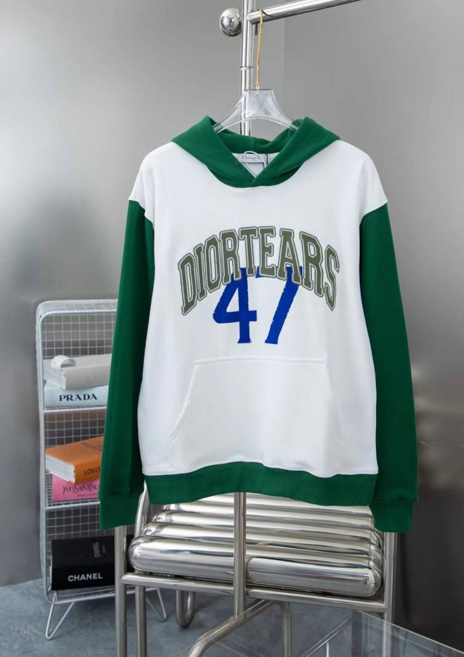 Толстовка Christian Dior LUX-112111 – это стильная толстовка в спортивном стиле. Основной цвет изделия – белый, с контрастными зелеными деталями на рукавах, капюшоне и манжетах. Толстовка декорирована надписью «DIORTEARS» и номером «47».