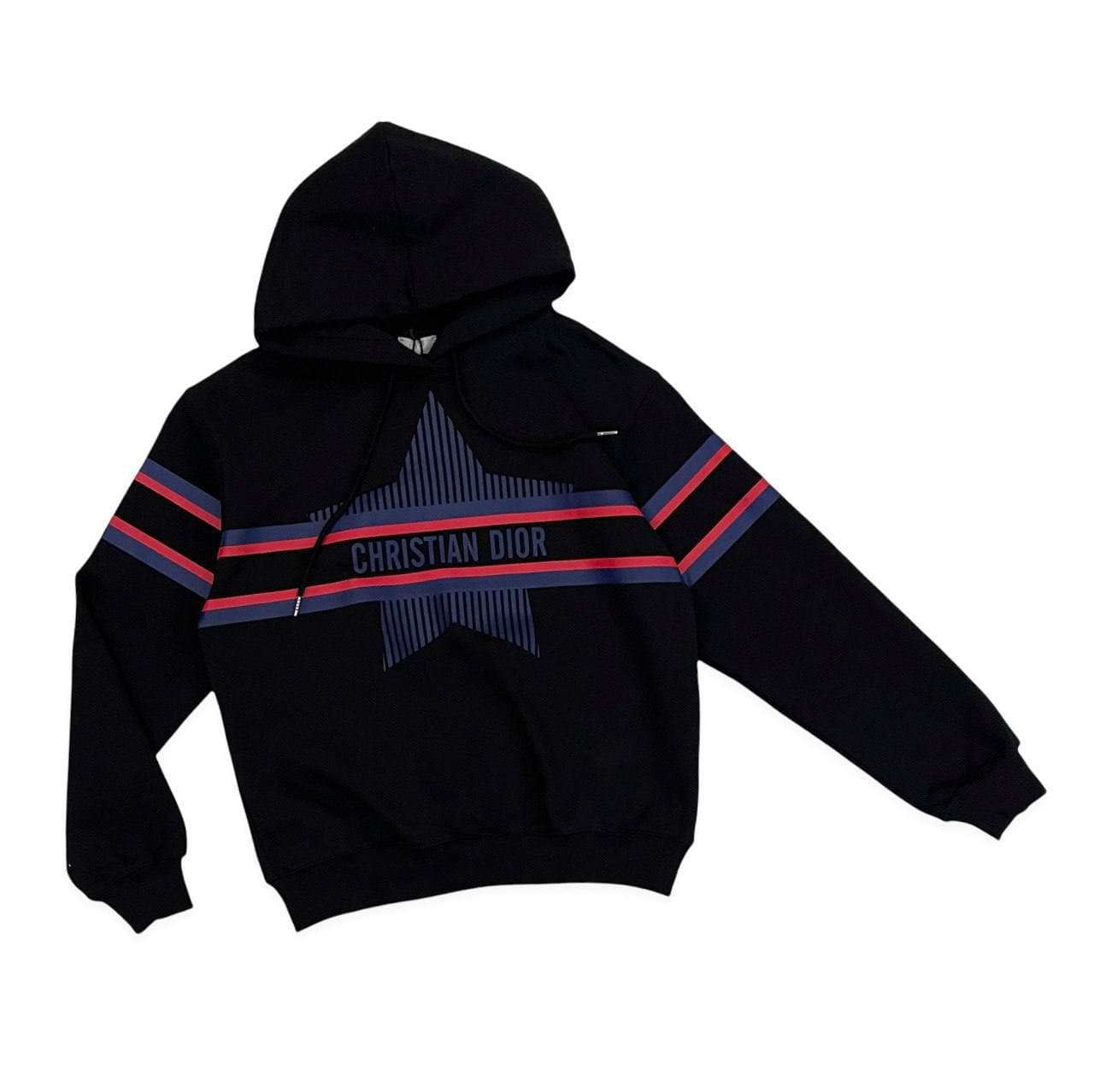 Толстовка Christian Dior LUX-58101 — это стильный и современный элемент гардероба, сочетающий в себе комфорт и узнаваемый дизайн бренда. Черный цвет в сочетании с синей и красной полосами и звездой, а также крупная надпись "CHRISTIAN DIOR" создают эффектный образ. Эта толстовка идеально подойдет для создания непринужденных и модных повседневных комплектов.