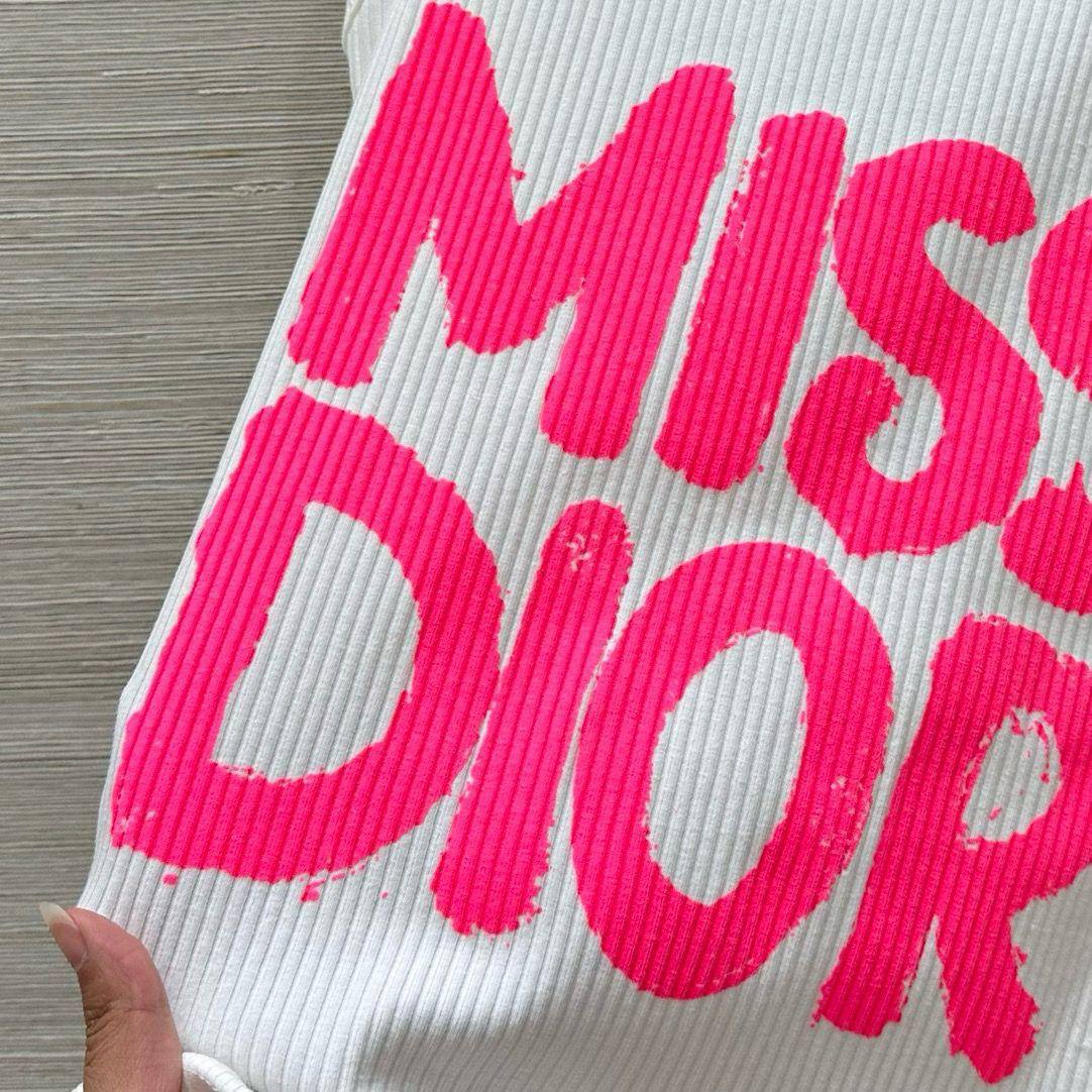 Топ Christian Dior LUX-115733 - это стильный топ от известного модного дома, выполненный в современном дизайне. Белый топ с яркой надписью "MISS DIOR" розового цвета, имеет облегающий силуэт, что делает его отличным выбором для создания модных образов. Отлично подойдет для повседневной носки.