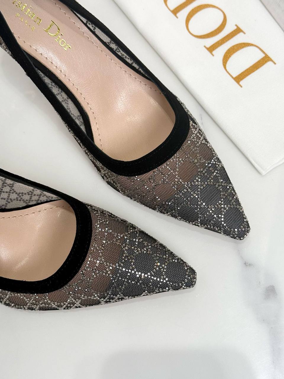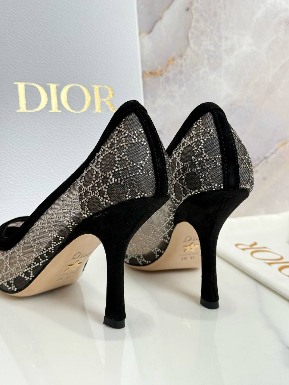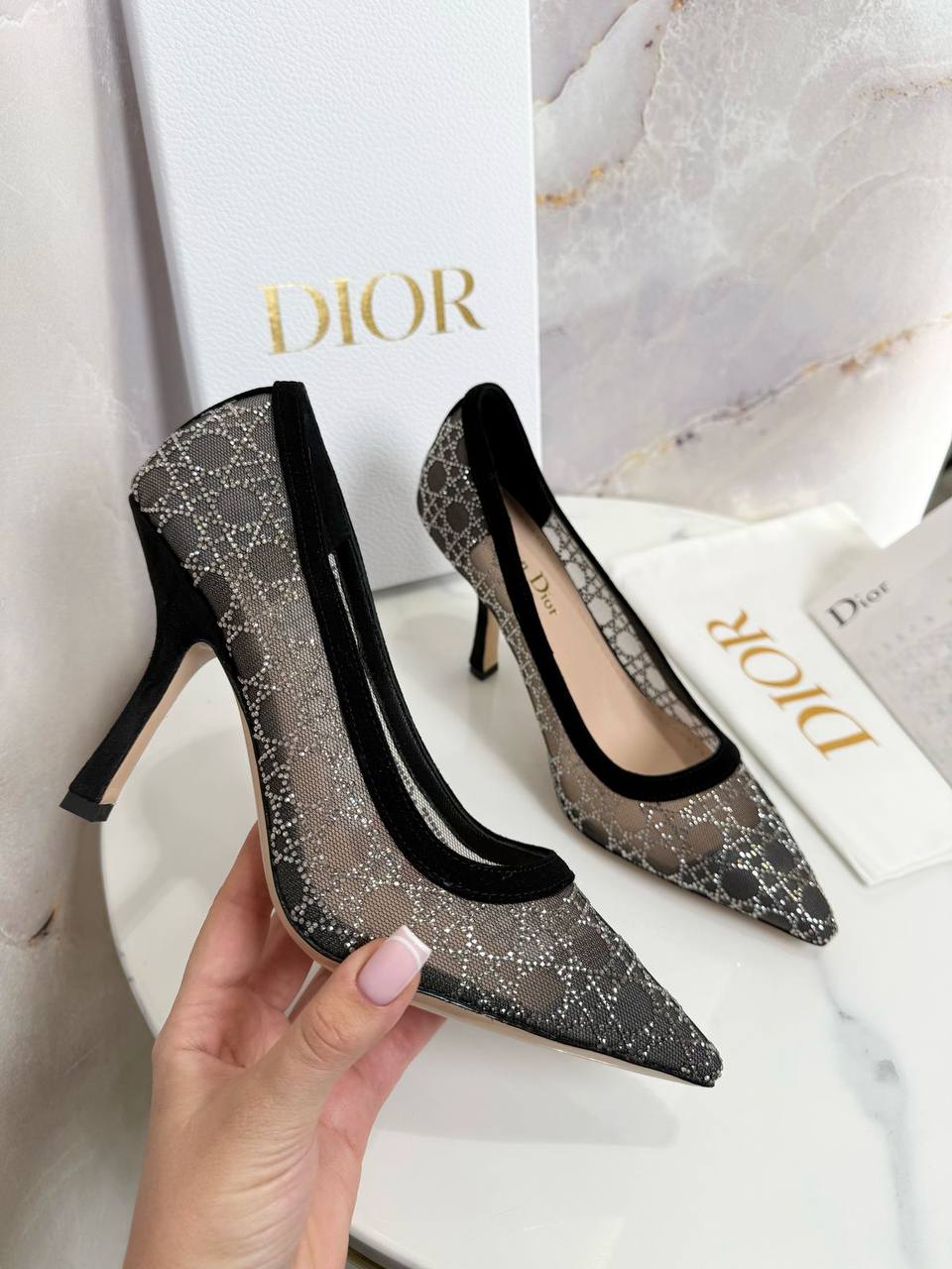 Туфли Christian Dior LUX-117005 представляют собой элегантную обувь на каблуке. Туфли выполнены в черном цвете, с сетчатой текстурой, украшенной узором. Они предназначены для создания стильного образа и могут быть уместны как на деловой встрече, так и на торжественном мероприятии.