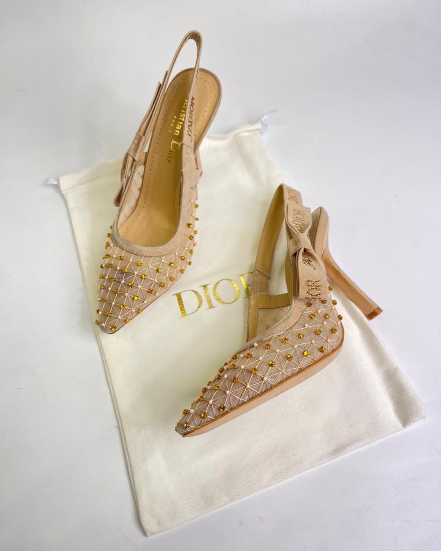 Эти изящные туфли Christian Dior LUX-44287 представляют собой элегантное дополнение к любому женскому гардеробу. Модель выполнена в нежном бежевом цвете, сочетающемся с изысканной отделкой в виде сетки и золотистых бусин, что придает обуви роскошный вид. Остроконечный носок и изящная шпилька подчеркивают утонченность дизайна.