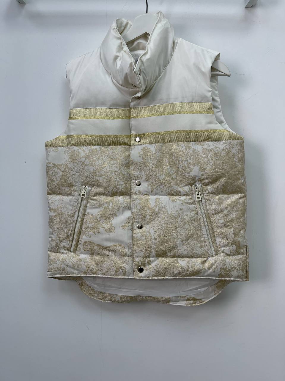 Жилет Christian Dior LUX-76095 представляет собой изысканный предмет гардероба. Жилет выполнен в кремово-белых тонах с золотистым узором. Его дизайн отличается элегантностью и роскошью, что делает его отличным выбором для создания стильных образов.