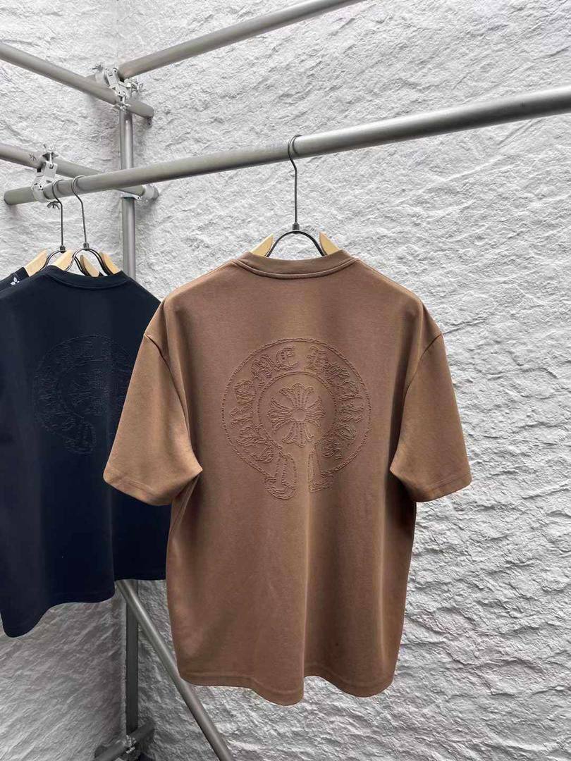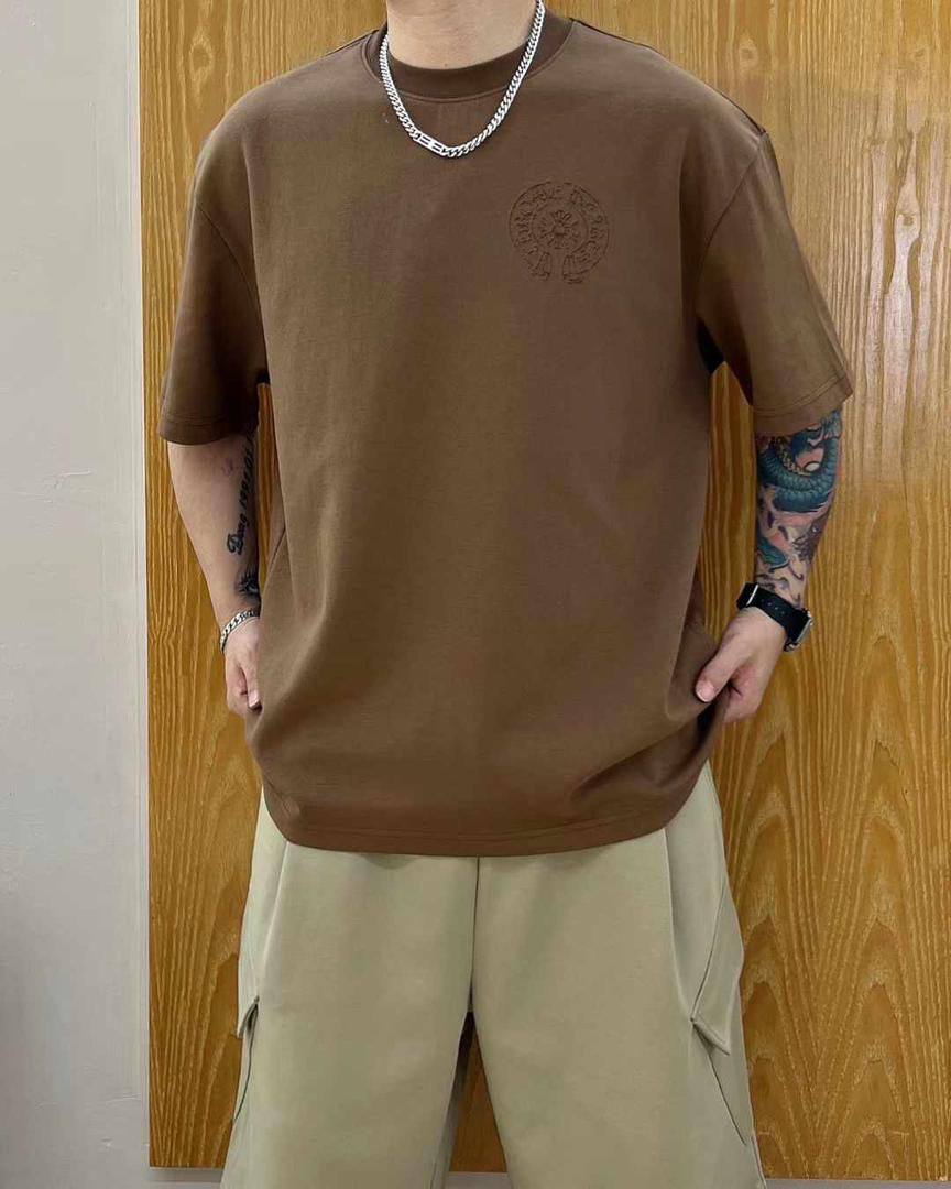 Футболка CHROME HEARTS LUX-108265 выполнена в классическом стиле. Она представлена в коричневом цвете, с круглым вырезом и короткими рукавами. На передней части футболки расположен круглый принт, который добавляет уникальности изделию.