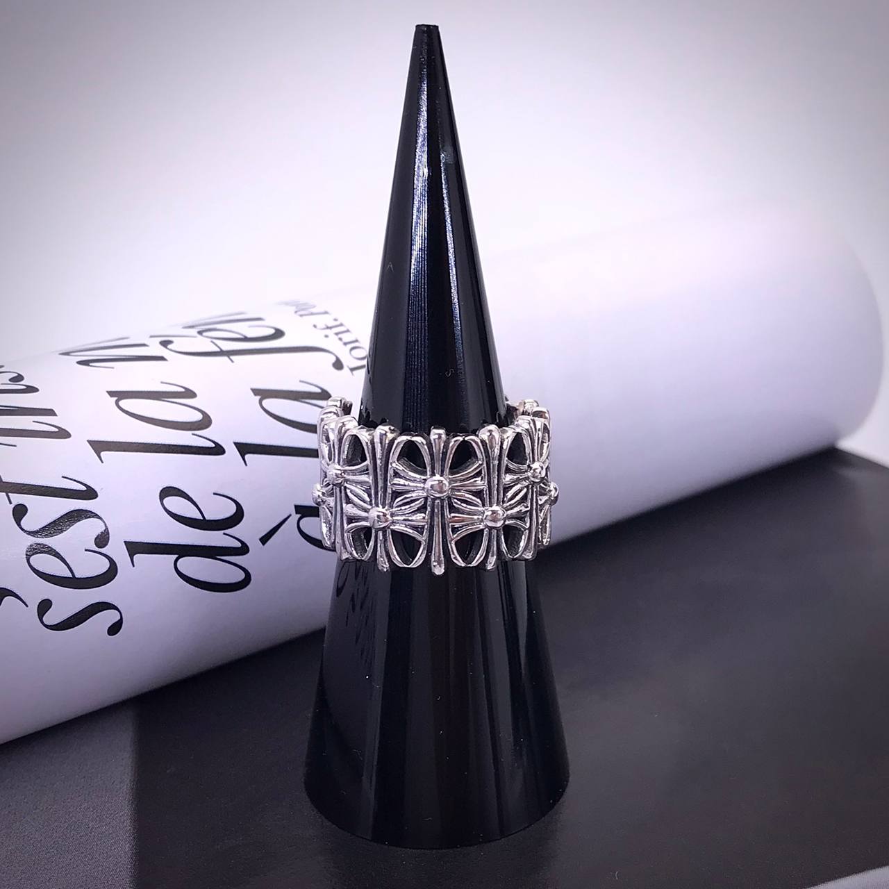 Кольцо CHROME HEARTS LUX-83238 представляет собой массивное серебряное украшение с узнаваемым дизайном. Кольцо выполнено в серебристом цвете, имеет текстурированную поверхность, созданную повторяющимся узором крестов. Аксессуар подойдет для повседневного ношения, добавляя индивидуальность и выразительность образу.