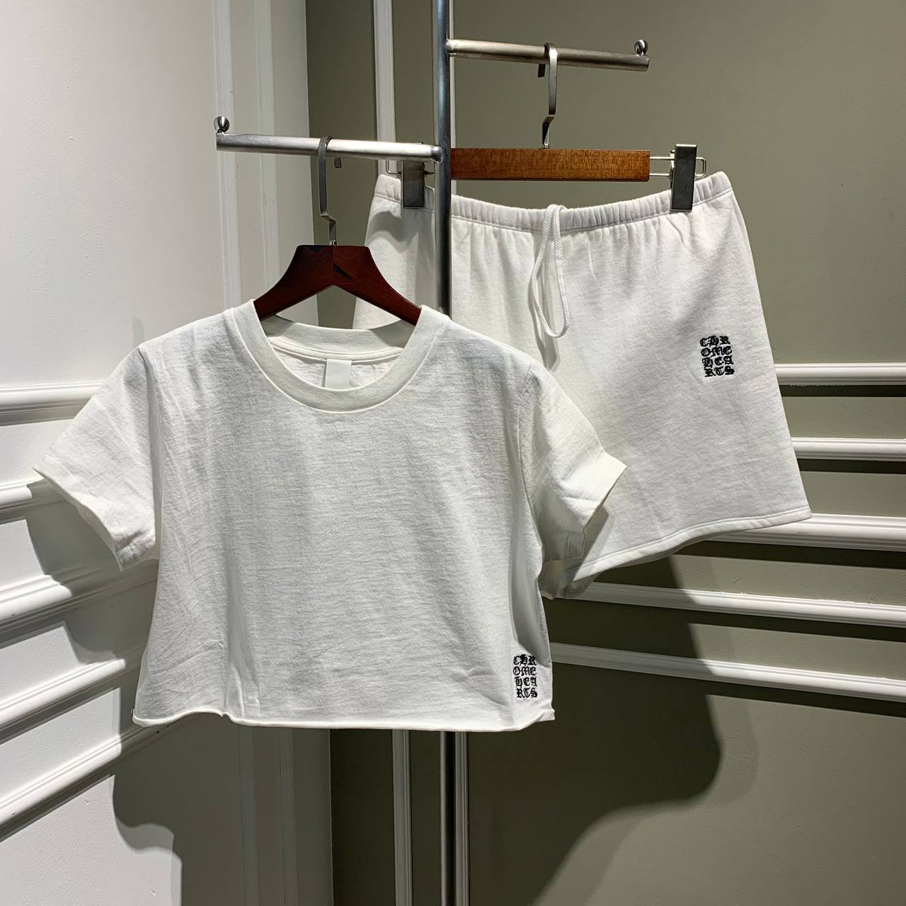 Представляем спортивный костюм CHROME HEARTS LUX-67211 – стильный и удобный комплект, состоящий из кроп-топа и шорт. Этот костюм идеально подойдет для создания расслабленных, но модный образов, как для занятий спортом, так и для повседневной носки.
