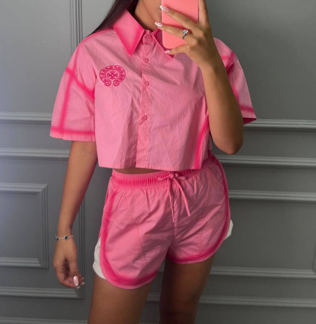 Костюм женский CHROME HEARTS LUX-107911 — это стильный и яркий комплект, выполненный в розовом цвете. Комплект состоит из укороченной рубашки с короткими рукавами и шорт на шнуровке. Дизайн включает контрастные элементы и логотип бренда.