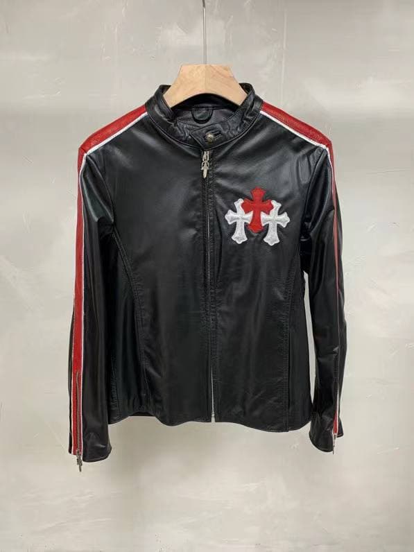 CHROME HEARTS LUX-59157 - кожаная куртка в стиле ретро-байкер, сочетающая в себе винтажный шарм и современный дизайн. Черная кожа дополнена контрастными красными вставками на плечах и рукавах, а также культовым логотипом бренда в виде крестов на груди, что придает изделию неповторимый характер. Эта куртка станет ярким акцентом в любом образе.
