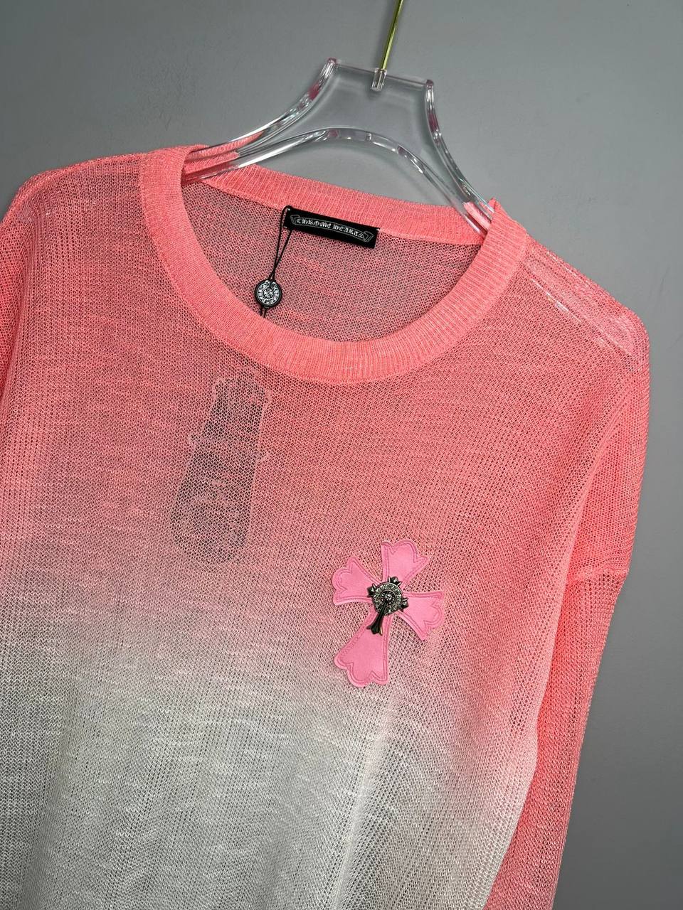 Лонгслив CHROME HEARTS LUX-93126 — это стильный предмет гардероба, который сочетает в себе модный дизайн и комфорт. Выполненный в двухцветной градиентной гамме от розового к белому, лонгслив имеет уникальную текстуру, придающую ему изысканный вид. Он идеально подходит для создания модных повседневных образов.