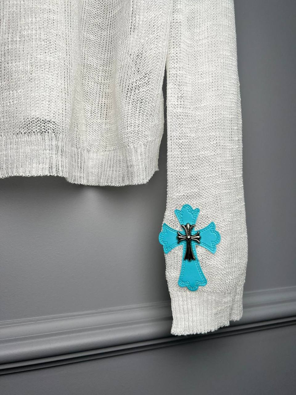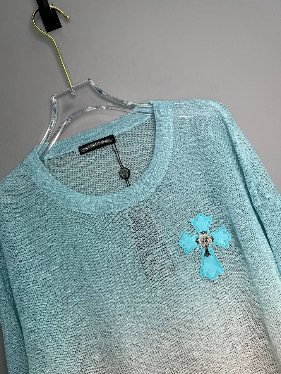 Лонгслив CHROME HEARTS LUX-93247 — это стильная и удобная одежда для повседневной носки. Этот лонгслив выполнен в градиентном дизайне от голубого к белому, что придает ему свежий и модный вид. Украшен крестообразными элементами, характерными для бренда.