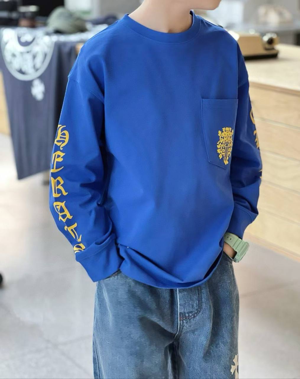 Лонгслив CHROME HEARTS LUX-118597 — это яркий представитель уличного стиля. Этот лонгслив выполнен в насыщенном синем цвете, украшен золотистыми принтами на рукаве и кармане, создавая контрастный и запоминающийся образ. Идеально подходит для создания повседневных и стильных образов.