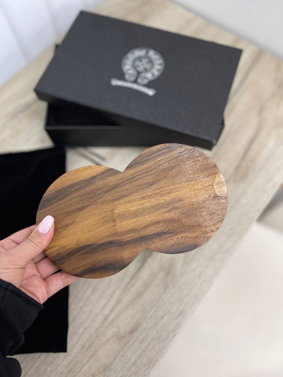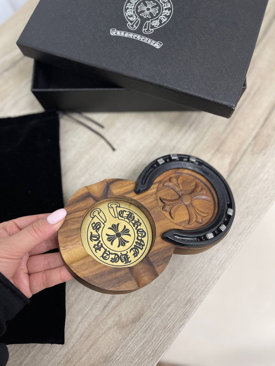 Пепельница CHROME HEARTS LUX-84108 – это изысканный аксессуар, сочетающий в себе функциональность и роскошь. Этот предмет отличается узнаваемым стилем бренда, который проявляется в каждой детали. Пепельница выполнена в сочетании тёплых древесных тонов и чёрных элементов.