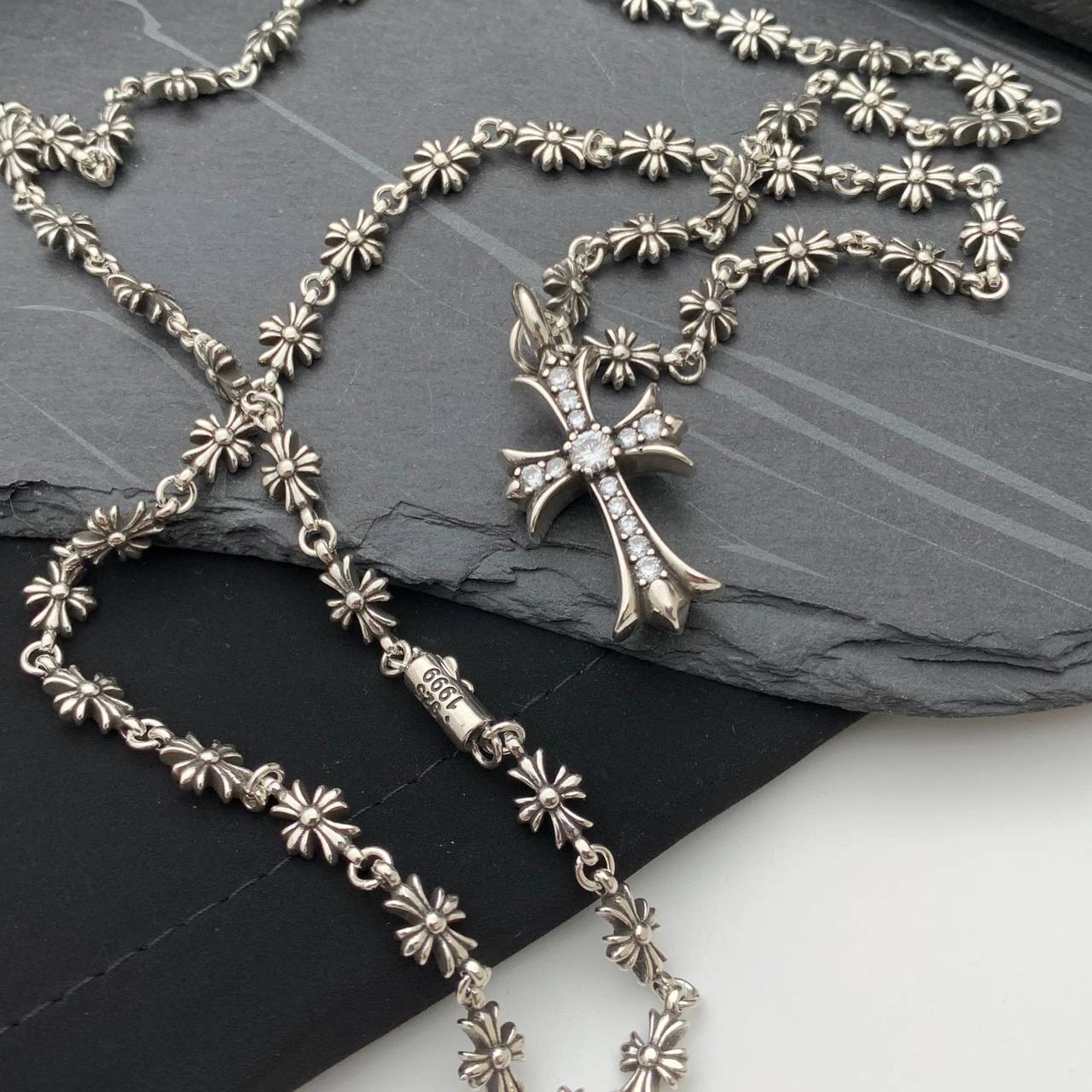 Подвеска CHROME HEARTS LUX-111753 — это роскошное украшение в готическом стиле. Серебристая подвеска в форме креста инкрустирована сверкающими камнями, а цепочка украшена узором из цветочных деталей. Этот аксессуар призван подчеркнуть индивидуальность и добавить акцент в образ.