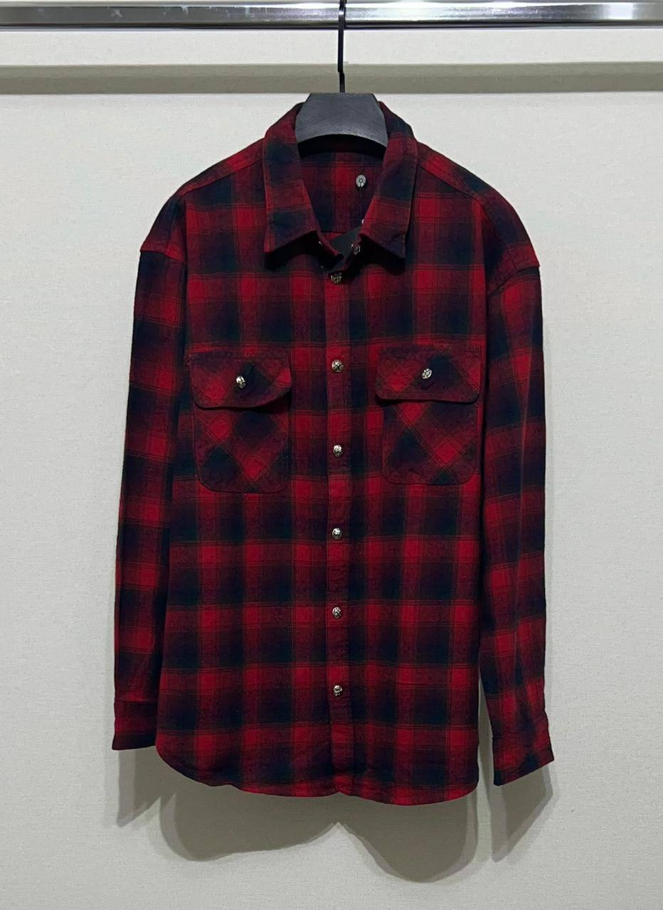 Рубашка CHROME HEARTS LUX-109201 выполнена в узнаваемом клетчатом дизайне, сочетая в себе элементы классического стиля с рок-н-ролльной эстетикой. Рубашка выполнена в насыщенных тонах красного и черного цветов. Классическая рубашка в клетку с длинными рукавами и двумя нагрудными карманами.