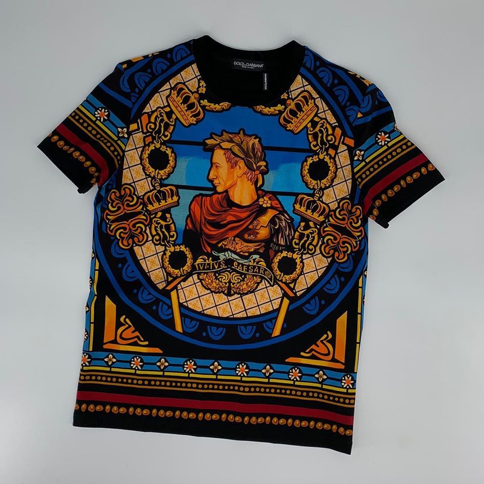 Футболка мужская Dolce & Gabbana LUX-27669 представляет собой яркое и стильное изделие, выполненное в классическом силуэте. Дизайн футболки вдохновлен античными мотивами, с центральным изображением Цезаря в обрамлении корон и орнаментов, что придает ей уникальный и узнаваемый вид. Модель прекрасно подойдет для создания эффектных повседневных образов.