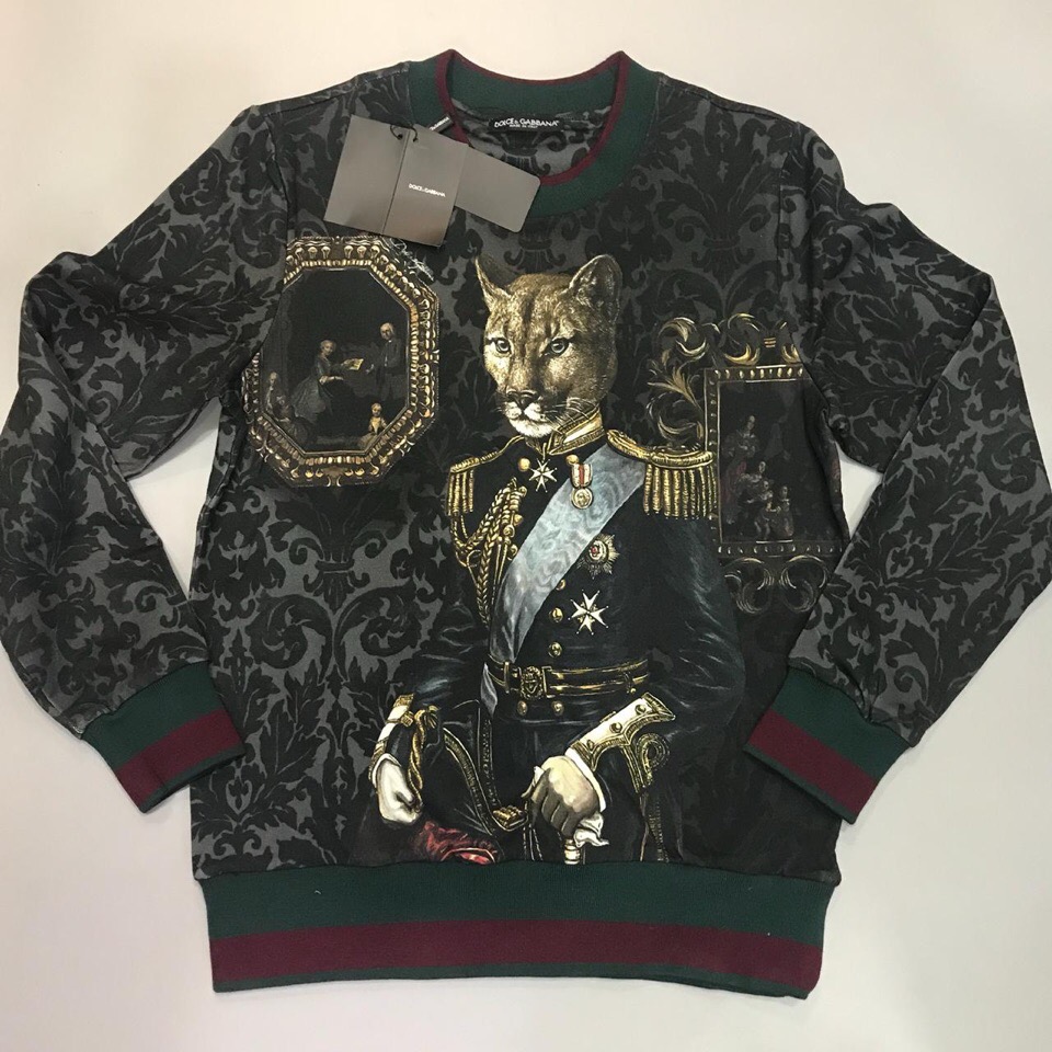 Стильная мужская кофта Dolce & Gabbana ОДМ-020 представляет собой уникальное сочетание классического дизайна с экстравагантным принтом. Эта модель выполнена в темных тонах, украшена изображением пумы в военной форме и изысканным дамасским узором, что придает ей роскошный и запоминающийся вид. Кофта идеально подойдет для создания ярких и модных образов.