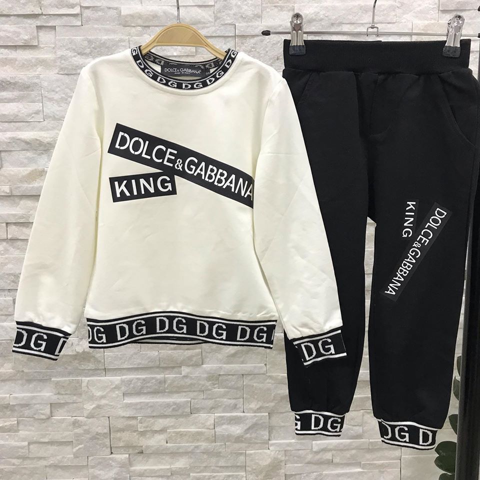 Спортивный костюм детский Dolce & Gabbana LUX-25890 представляет собой стильный и комфортный комплект для активных детей. Белый свитшот с контрастными черными надписями "DOLCE & GABBANA KING" и черные брюки с аналогичным декором создают эффектный образ. Эластичные манжеты и пояс обеспечивают идеальную посадку, а качественные материалы гарантируют долговечность и удобство при носке. Этот костюм идеально подходит как для занятий спортом, так и для повседневных прогулок, подчеркивая индивидуальность вашего ребенка.