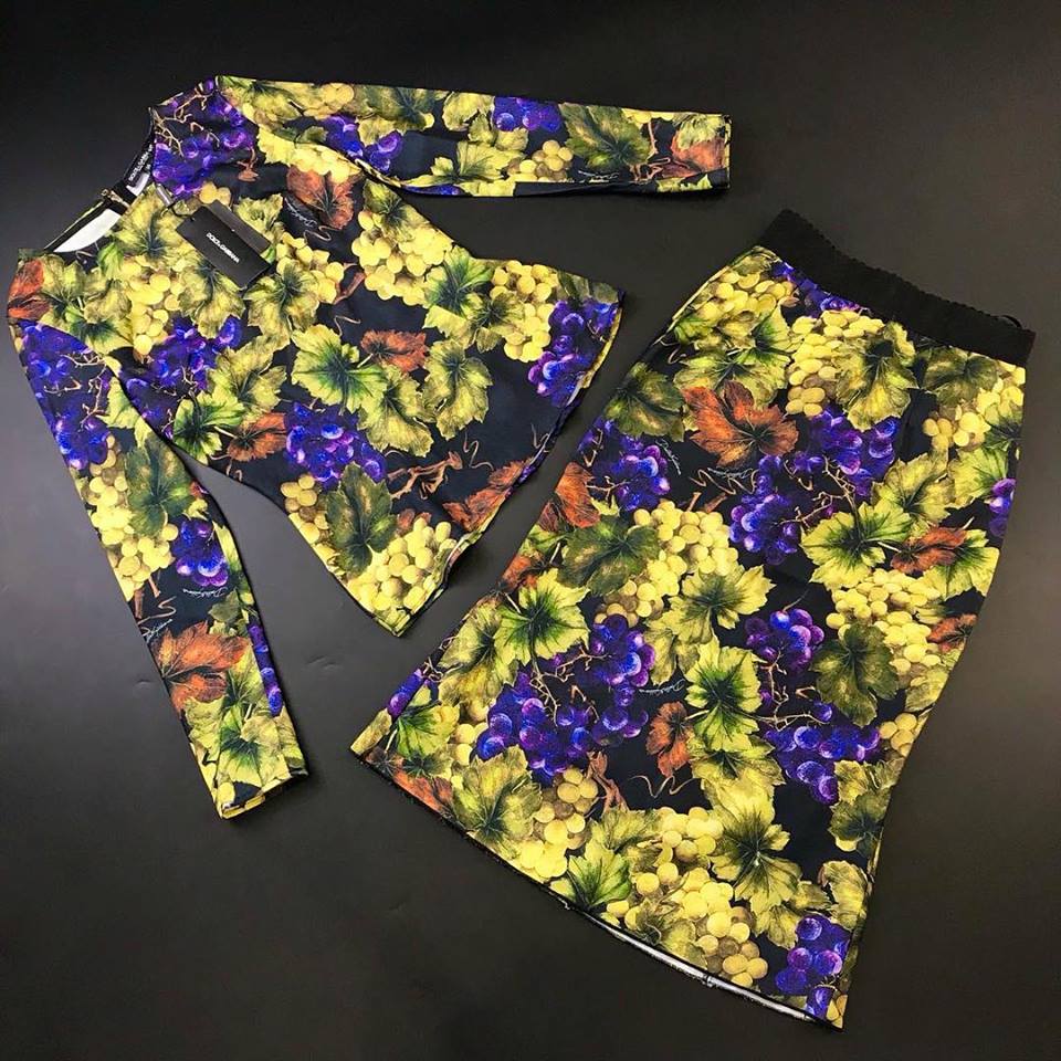 Этот женский юбочный костюм Dolce & Gabbana LUX-11075 представляет собой яркое и стильное решение для создания запоминающихся образов. Оригинальный принт с изображением гроздей винограда и листьев на темном фоне придает костюму изысканность и уникальность. Костюм идеально подходит для ценителей роскоши и итальянского стиля.