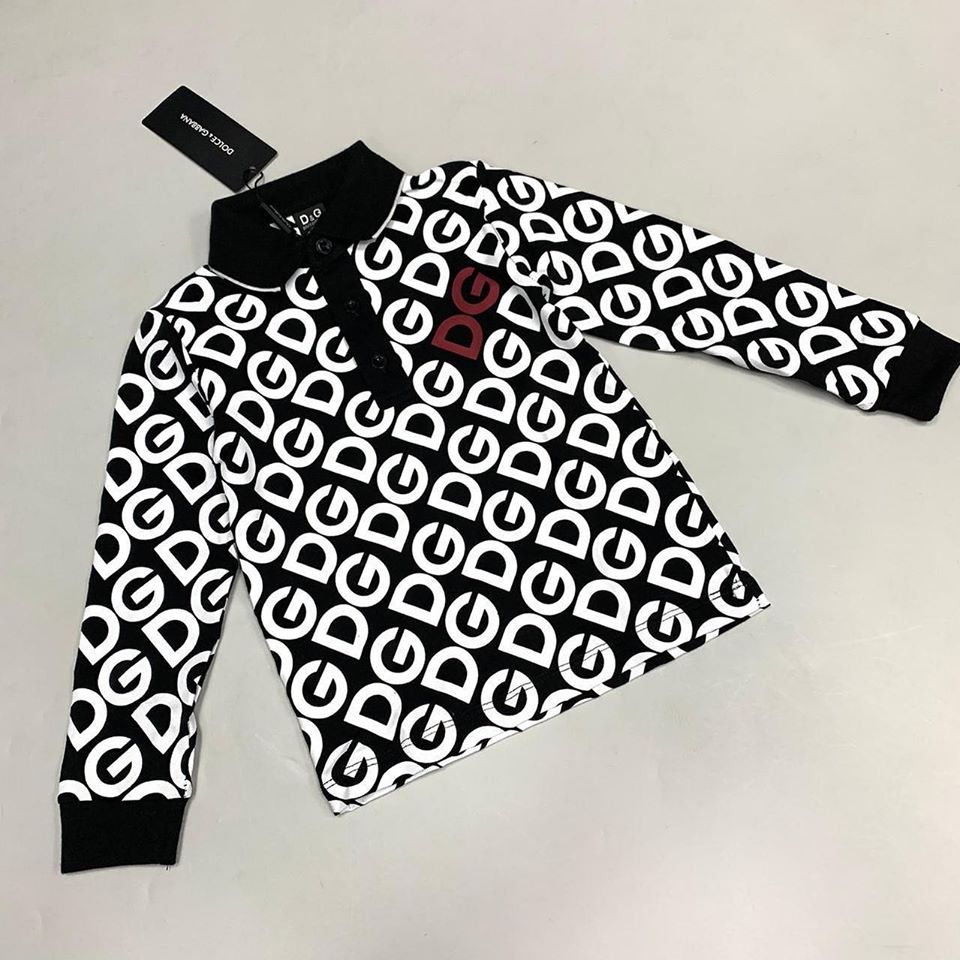 Лонгслив Dolce & Gabbana LUX-27512 представляет собой стильный и узнаваемый элемент гардероба. Модель выполнена в классическом стиле поло с воротником и планкой на пуговицах, но выделяется эффектным черным фоном, покрытым повторяющимся принтом из белых монограмм "DG". На груди присутствует контрастная красная надпись "DG", добавляющая акцент.
