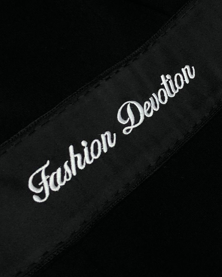 Платье Dolce & Gabbana ОДЖ-1391 — элегантное черное платье, выполненное в классическом стиле. Модель отличается лаконичным силуэтом и акцентированным поясом с надписью "Fashion Devotion", что придает ей особый шарм. Подол платья также украшен контрастной лентой с принтом.