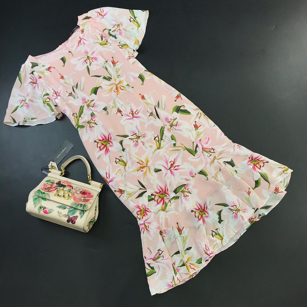 Платье Dolce & Gabbana LUX-31152 представляет собой женственное и элегантное изделие. Модель выполнена в нежно-розовом цвете и украшена изысканным цветочным принтом с изображением лилий. Легкий крой и расклешенный подол с оборками придают платью романтичный и утонченный вид, идеально подходящий для летних мероприятий или вечерних выходов.
