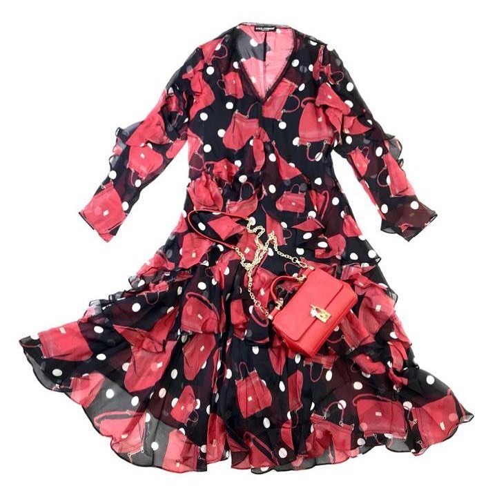 Платье Dolce & Gabbana LUX-32017 — это элегантное и яркое изделие, выполненное в узнаваемом стиле бренда. Модель декорирована оригинальным принтом с изображениями дамских сумочек и горошком, что придает ей игривый и женственный характер. Многослойные оборки по подолу и на рукавах добавляют платью воздушности и динамики.