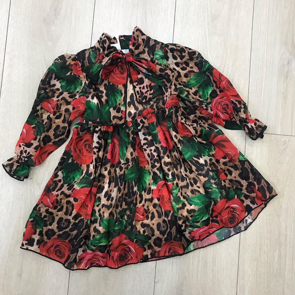 Это очаровательное детское платье Dolce & Gabbana LUX-22891 сочетает в себе дерзкий леопардовый принт с нежными красными розами и зелеными листьями. Изысканный бант на воротнике-стойке добавляет игривости, а пышные рукава и легкая юбка создают праздничный образ. Платье идеально подойдет для особых случаев и фотосессий.