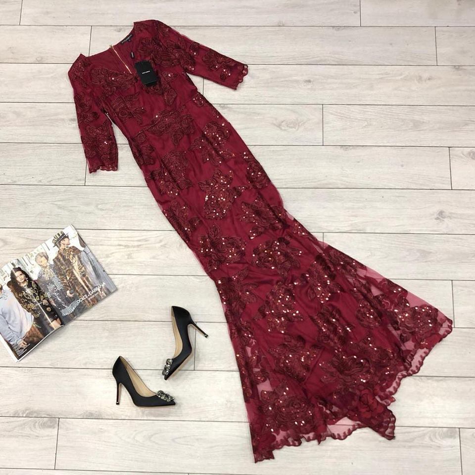Это роскошное вечернее платье Dolce & Gabbana ОДЖ-1317 выполнено в глубоком бордовом цвете и декорировано изящной кружевной аппликацией и мерцающими пайетками. Силуэт платья подчеркивает фигуру, плавно расширяясь к низу, создавая элегантный образ. Трикотажная основа платья обеспечивает комфортную посадку, а кружево и пайетки добавляют изысканности и гламура.