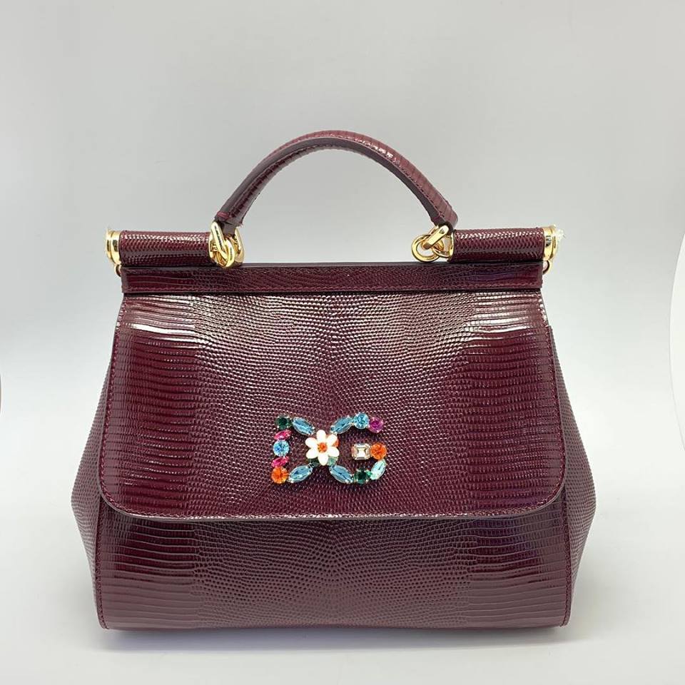 Эта женская сумка Dolce & Gabbana LUX-5109 представляет собой изысканный аксессуар в классическом стиле. Глубокий бордовый цвет и фактурная кожа с тиснением под рептилию придают ей роскошный вид. Декоративный элемент в виде логотипа "DG", украшенный разноцветными кристаллами, добавляет образу уникальности и гламура. Сумка идеально подойдет для создания элегантных вечерних и дневных образов, подчеркивая статус и безупречный вкус своей обладательницы.