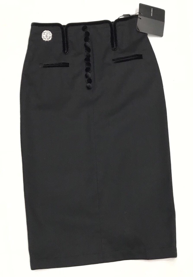 Элегантная юбка Dolce & Gabbana ОДЖ-546 выполнена в классическом черном цвете, что делает ее универсальным элементом гардероба. Дизайн юбки отличается высокой посадкой, акцентированной бархатной отделкой и рядом декоративных пуговиц, что придает ей утонченный вид. Оригинальная брошь на поясе добавляет изделию изысканности и роскоши, подчеркивая статус бренда.