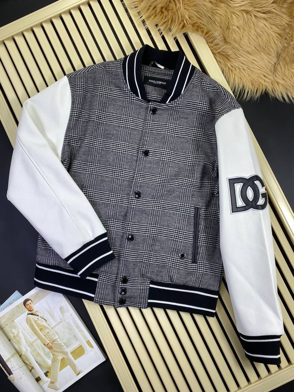 Бомбер Dolce & Gabbana LUX-83687 — это стильный предмет гардероба, выполненный в классическом стиле. Основной цвет — черно-белая клетка, с белыми рукавами и деталями на воротнике и манжетах. Этот бомбер идеально подходит для создания модных и универсальных образов.