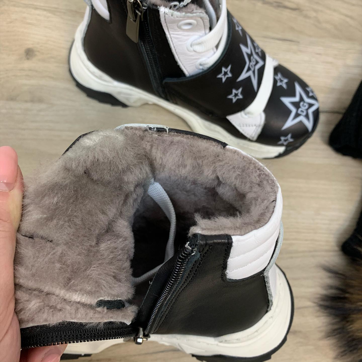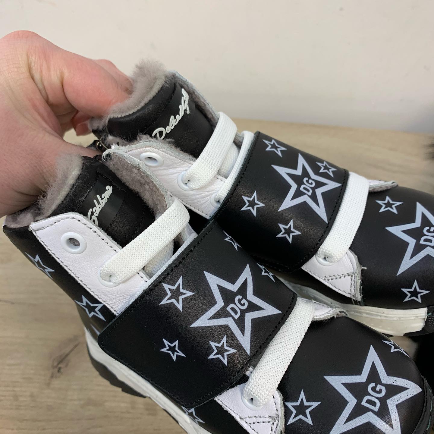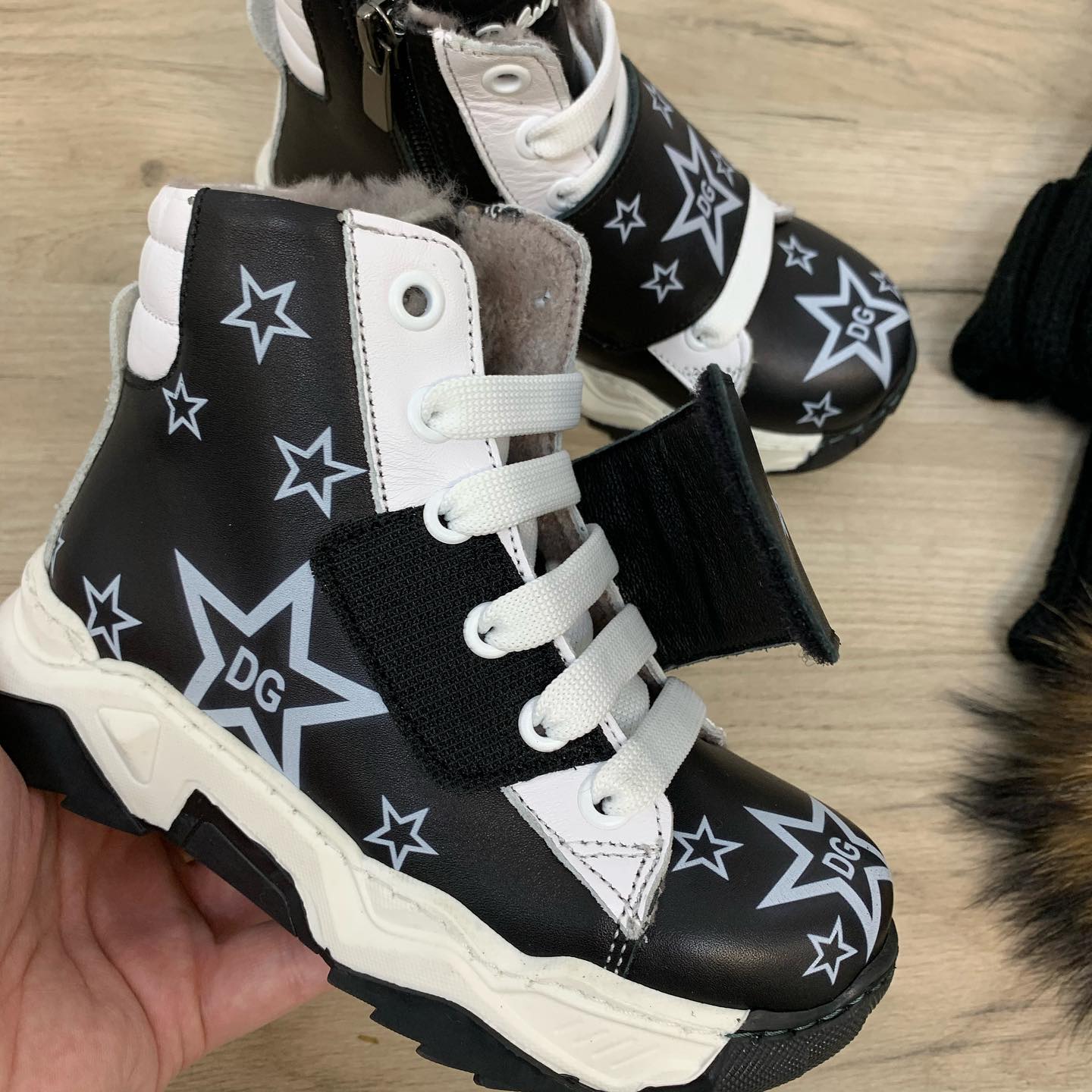 Эти эффектные ботинки Dolce & Gabbana LUX-37122 в черном цвете с контрастными белыми звездами и логотипами "DG" привлекут внимание юных модников. Сочетание натуральной кожи и меха внутри гарантирует комфорт и тепло в холодное время года. Модель с боковой молнией и липучкой обеспечит удобство при обувании.