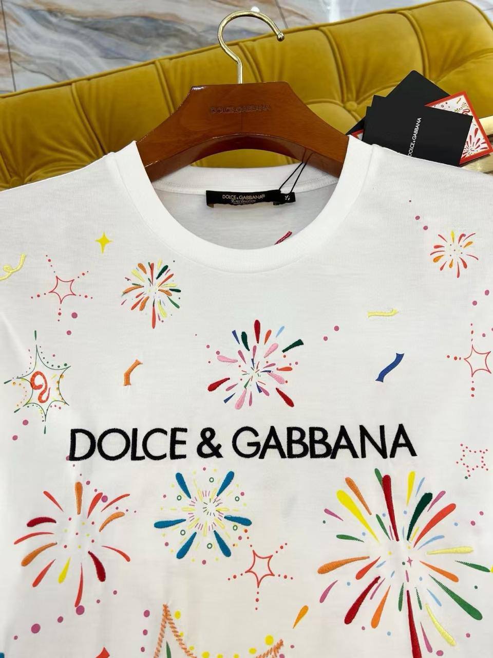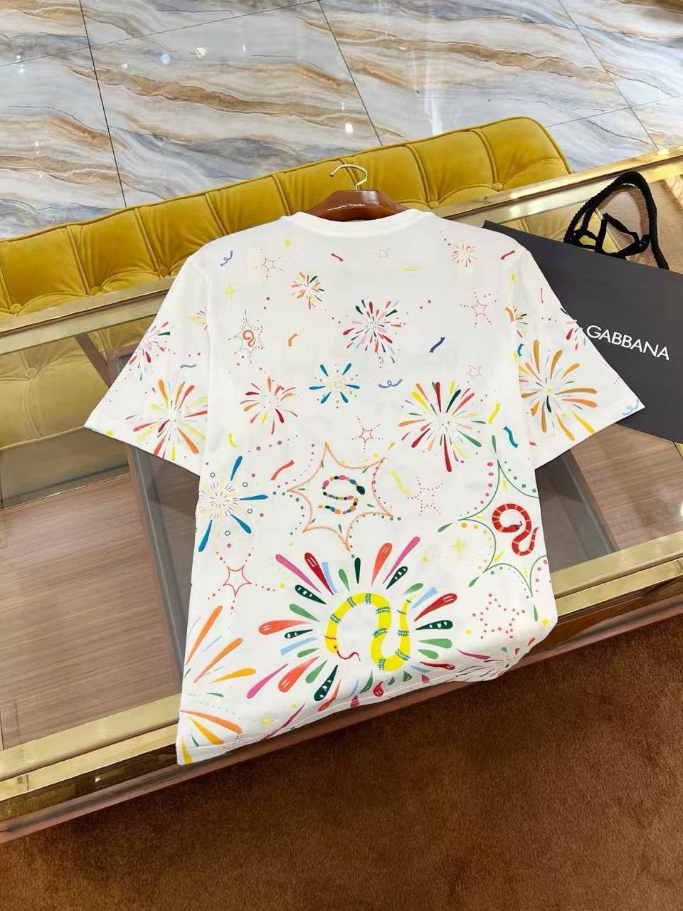 Футболка Dolce & Gabbana LUX-120401 – стильный и яркий элемент гардероба для тех, кто ценит оригинальность. Модель отличается красочным принтом с изображением фейерверков.