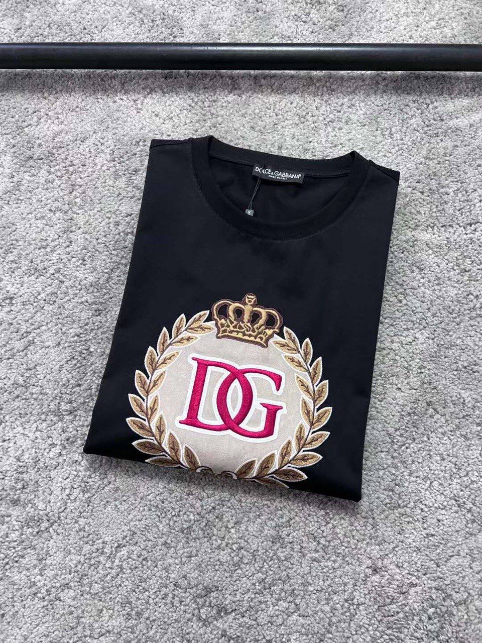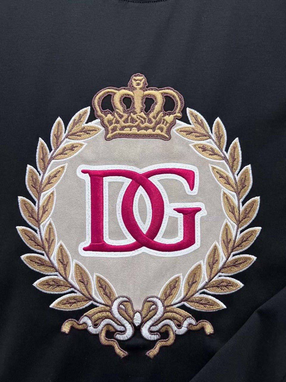 Футболка Dolce & Gabbana LUX-84965 - это стильная черная футболка с круглым вырезом и короткими рукавами. Центральным элементом дизайна является вышитый логотип бренда в виде короны и инициалов "DG" в центре лаврового венка. Идеально подходит для создания повседневных образов.