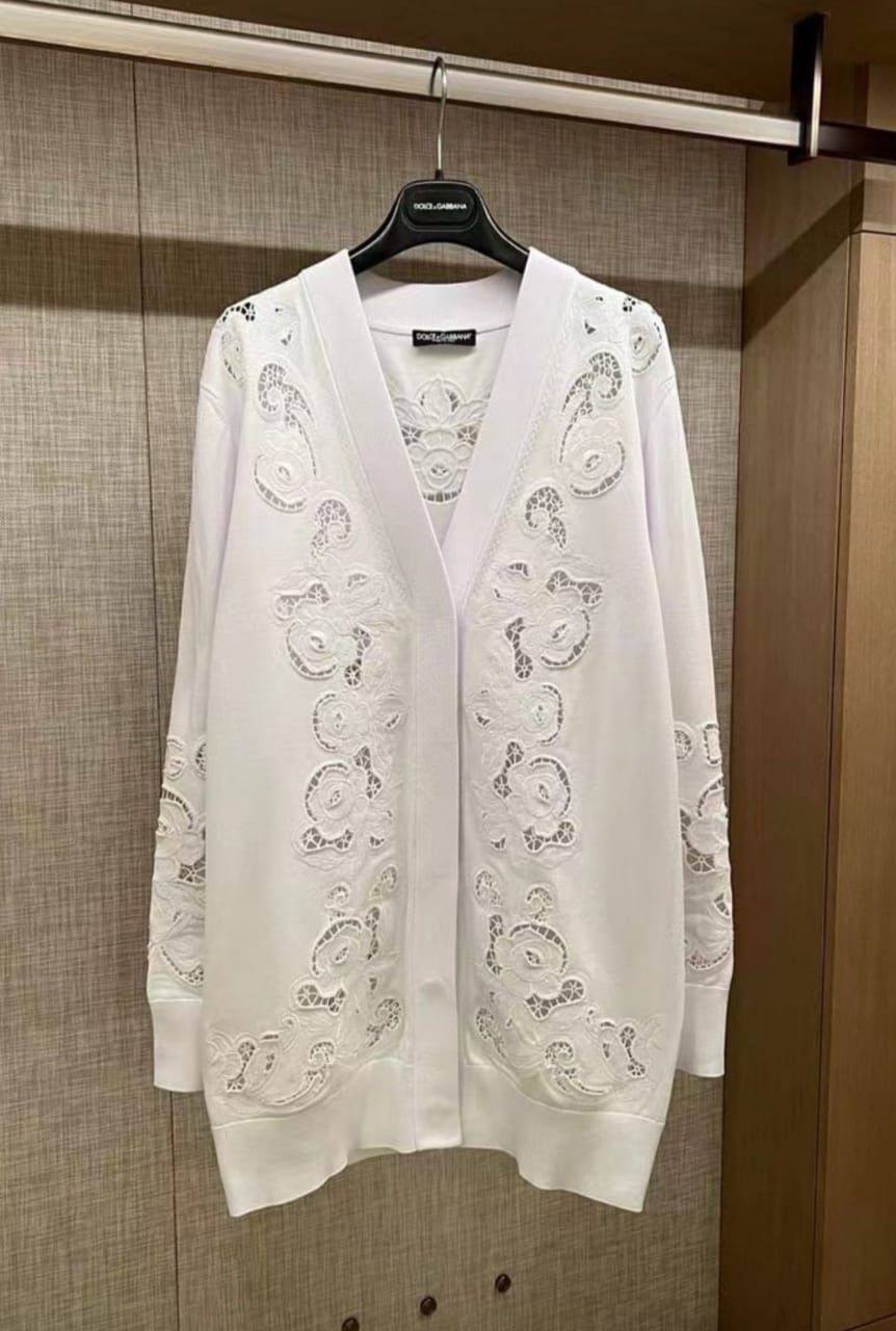 Кардиган Dolce & Gabbana LUX-68500 представляет собой элегантное дополнение к женскому гардеробу. Изделие выполнено в классическом белом цвете и украшено изысканным кружевным узором, напоминающим цветочные мотивы. V-образный вырез и свободный крой придают ему непринужденный, но в то же время утонченный вид. Этот кардиган идеально подходит для создания как повседневных, так и более нарядных образов, добавляя им изысканности и шарма.